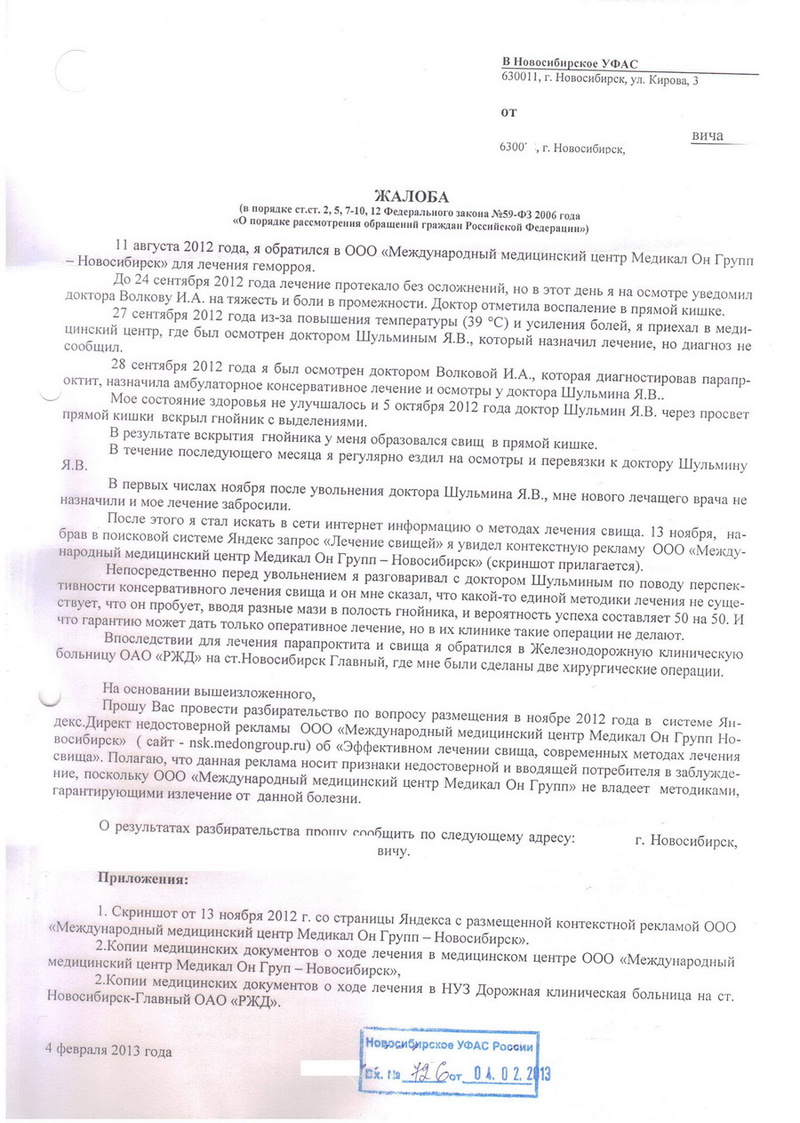 • Вчера подал жалобу в Новосибирское УФАС на размещение ООО "Международный медицинский центр Медикал Он Групп Новосибирск" недостоверной контекстной рекламы в ЯндексДирект.