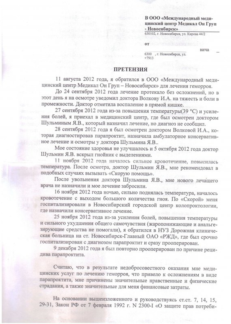 • Пока ждем ответа на претензию от Медикал Он Групп Новосибирск- потихоньку собираем документы для суда.