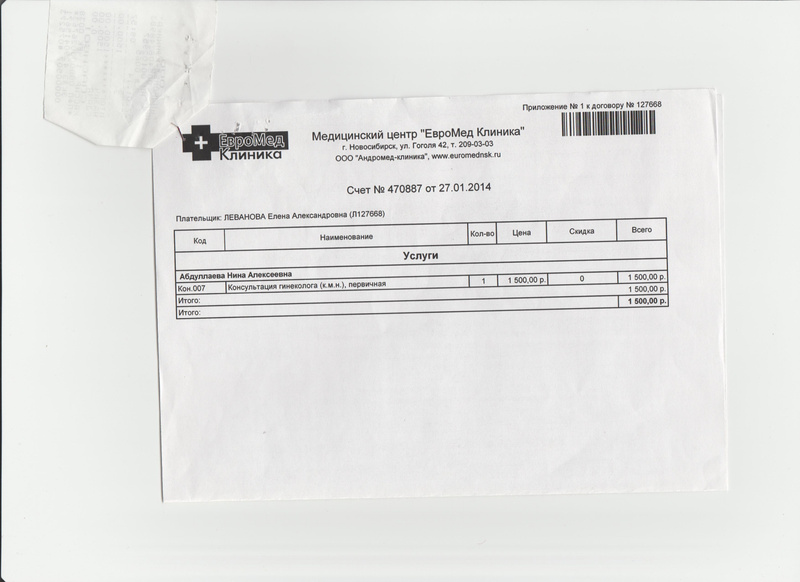 27.01.2014 г. Леванова Е.А. обратилась в ООО «Андромед-клиника» с целью выявления возможной патологии шейки матки и дальнейшего ее лечения. Ранее при осмотре Левановой Е.А. врачом-гинекологом в клинике «Ваше Здоровье» был диагностирован паталогический процесс в тканях шейки матки. Однако клиника «Ваше здоровье» не имела возможности провести необходимые исследования и лечение поражения шейки матки, в связи с чем, Истец сменила медицинскую организацию на ООО «Андромед-клиника», позиционирующую себя, как клиника с современным подходом к нерожавшим пациенткам, что и привлекло Истца. Администраторы ООО «Андромед-клиника» порекомендовали Истцу доктора Абдуллаеву Н.А. На прием Леванова Е.А. пришла с уже имеющимися результатами исследований: результатами произведенных анализов, результатами кольпоскопии с рекомендациями, паспорт здоровья работника № 11119, от 27.12.2013 г., результат анализа на ВПЧ. Факт первичной консультации гинеколога Абдуллаевой Н.А. подтверждается Счетом № 470887 от 27.01.2014 г., а так же кассовым чеком на сумму 1500 рублей 00 копеек. В ходе приема врачом Абдуллаевой Н.А. было проведено цитологическое исследование эрозии шейки матки, что подтверждается Талоном