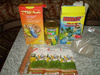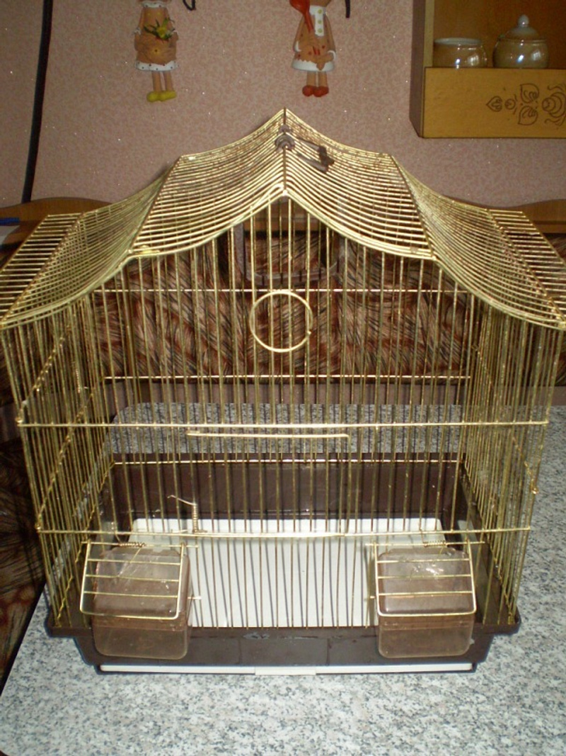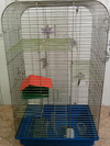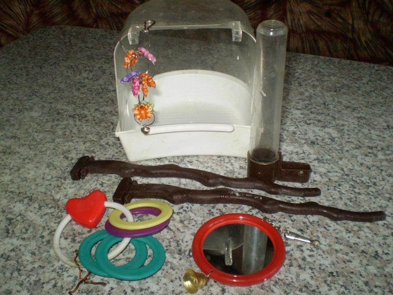 две кормушки,жердочка, поилка.