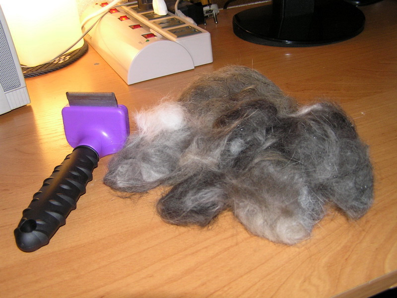 Во-первых, он лежал молча и не рычал, как это бывает при вычесывании расческой и даже не делал попытки удрать, из чего я сделала вывод, что пух выдергивается более аккуратно и менее травматично для его кожи, и во-вторых, пуха явно было больше обычного, хотя я его вычесывала буквально на днях.Маш, повезло тебе.