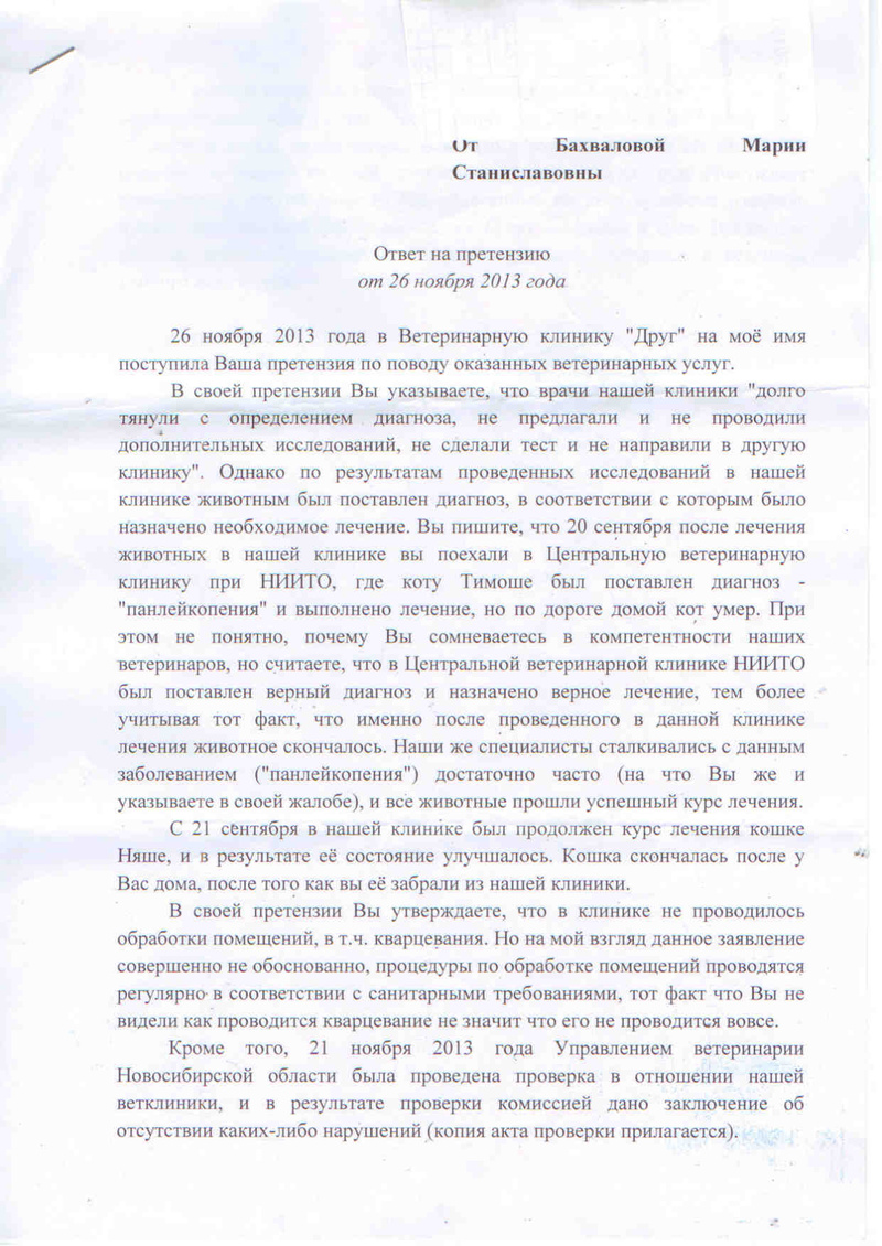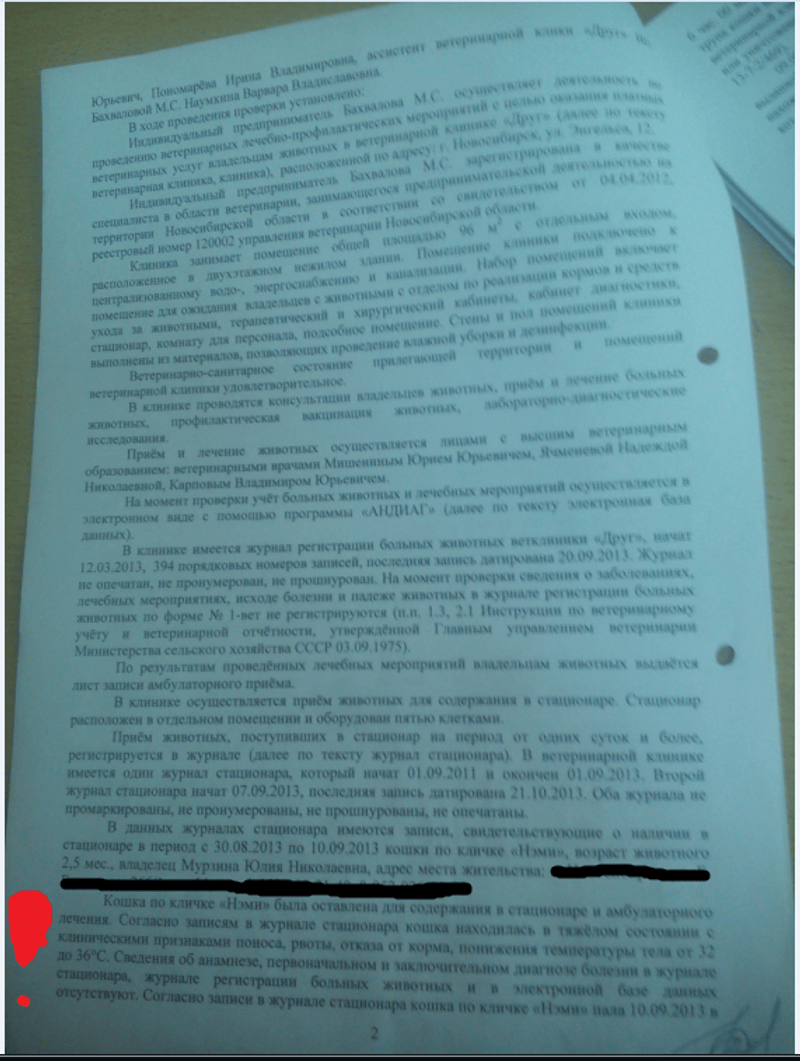 - Во время нахождения кота в стационаре 09.09.13г. в стационаре находилась кошка по кличке "Нэми" с теми же самыми клиническими признаками, что и у моих котов. Диагноз ей не установили за 10 дней (акт проверки управления Ветеринарии по НСО ниже)! А мои животные точно заразились где угодно но только не в данной ветеринарной клиники... ну точно