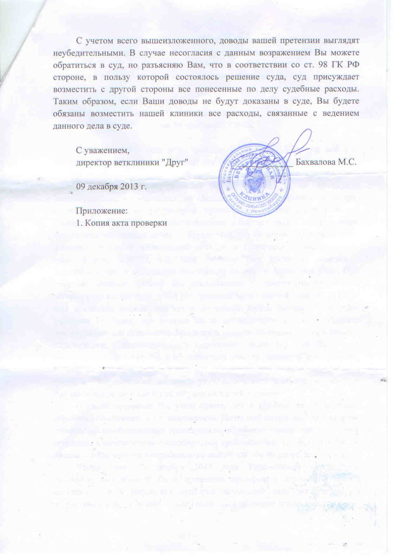 По результатам проведенной проверки Вет.клиника "Друг" (ИП Бахвалова М.С.) оштрафована за нарушение правил карантина животных или других ветеринарно-санитарных правил! А так же готовятся документы на привлечение к административной ответственности по факту нарушения законодательства в сфере обращения лекарственных средств для ветеринарного применения П.6. Если уж выкладываете такие серьезные обвинения в адрес клиники на всеобщее обозрение - выкладывайте и доказательства.