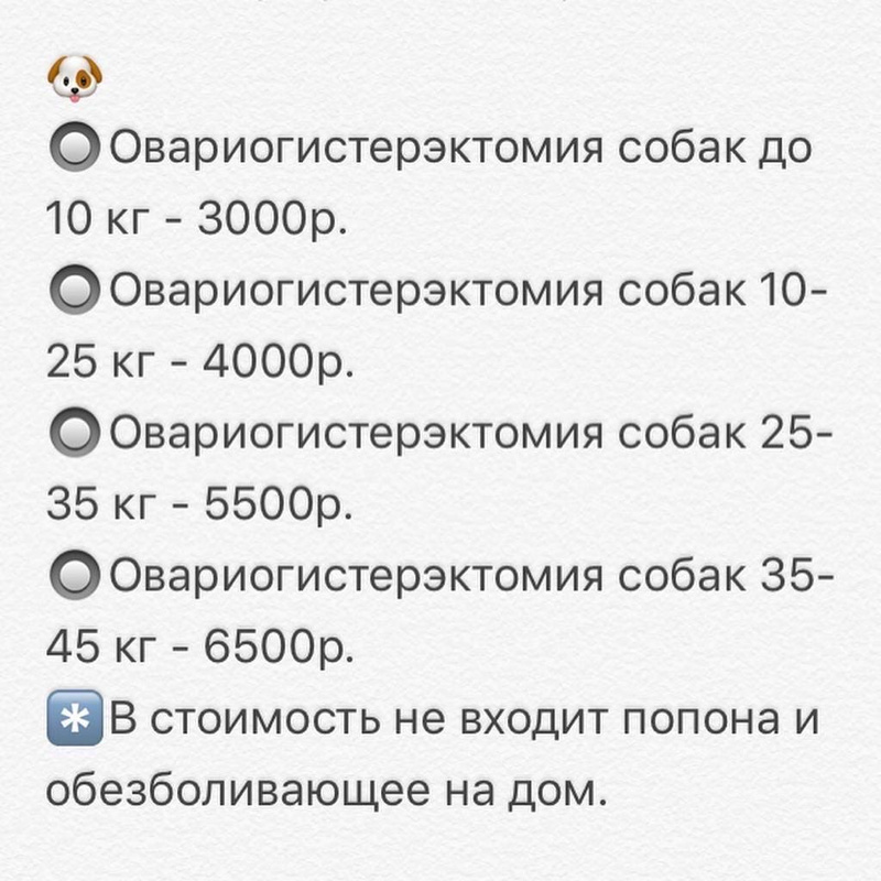 * в стоимость включены все расходные материалы, пребывание животного в стационаре 1 сутки + защитный воротник/попона.