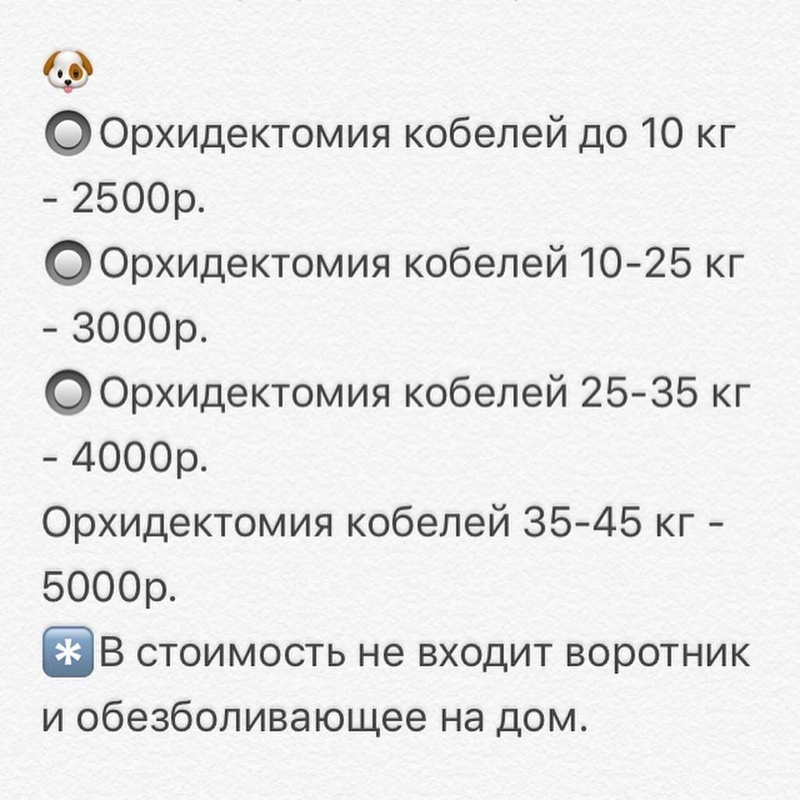 2. Льготная кастрация/стерилизация кобелей/сук весом до 15кг: скидка 25% от прайсовой стоимости.