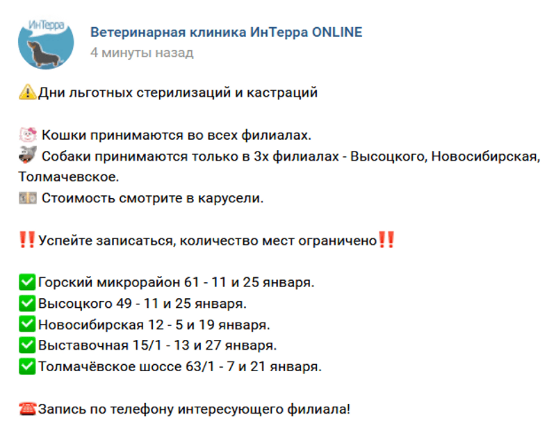 У жителей Советского района есть возможность стерилизовать домашнее животное по льготной цене 8 и 24 июля по адресу ул. Кутателадзе, 14а, бердчане смогут провести льготную стерилизацию питомца 13 и 30 июля на Комсомольской, 3. По двум адресам расположена ветеринарная клиника «Доктор Вет». Всем кураторам бездомных собак организаторы акции сообщают: – стерилизация любой бездомной собаки в "Ветлекаре" на Красном, 169/1 – 1500 руб.; дни акции – каждый понедельник и четверг; – стерилизация бездомной собаки весом до 25 кг в "Ветцентре на Высоцкого, 49" – 1500 руб.; дни акции – каждый вторник и суббота. Записываться нужно в группе.