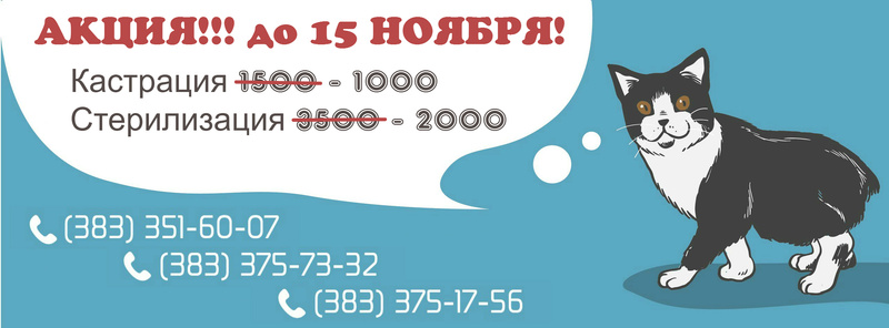 Со следующей недели, примерно с 19 сентября, ветклиника "АЛФЕЯ" объявляет ежегодную осеннюю льготную акцию по стерилизации кошек и кастрации котов. В приоритете - бродячие и подобранные животные.