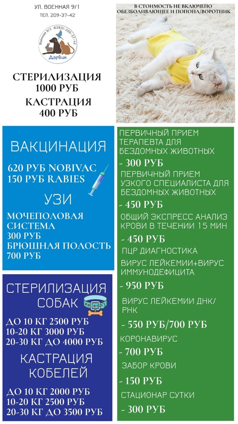 Стоимость: кошки от 300, собаки от 500 рублей (эти деньги идут на оплату расходных материалов и медикаментов для операции).