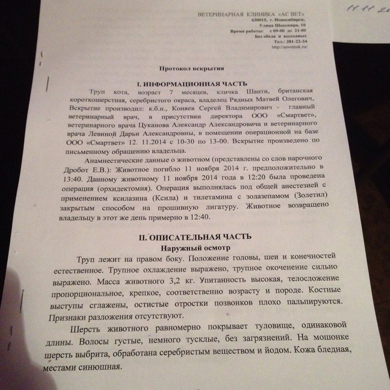 Алексей, да..то же хотела у ТС уточнить этот момент, как могли кота увезти на вскрытие без разрешения хозяйки .. второго выхода там нет на улицу, что бы тайком сделать.