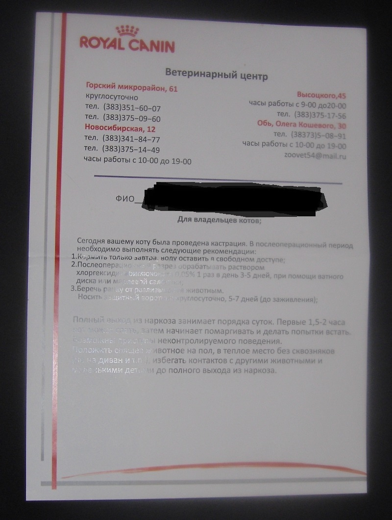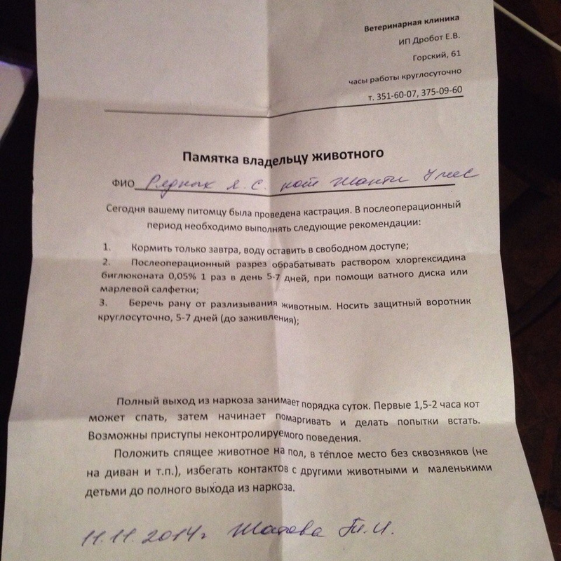 На Горском кстати еще памятку владельцу животного потом выдают, где написаны примерные сроки выхода из наркоза и что делать дальше.