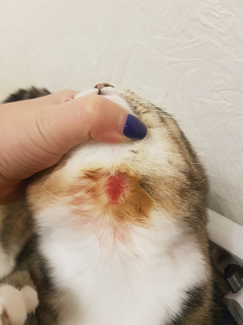 Уже какое то время кошка расчесывает шею (( Периодически промываю перекисью, а сегодня еще и йодом. Может, у кого уже такое было и что делали?