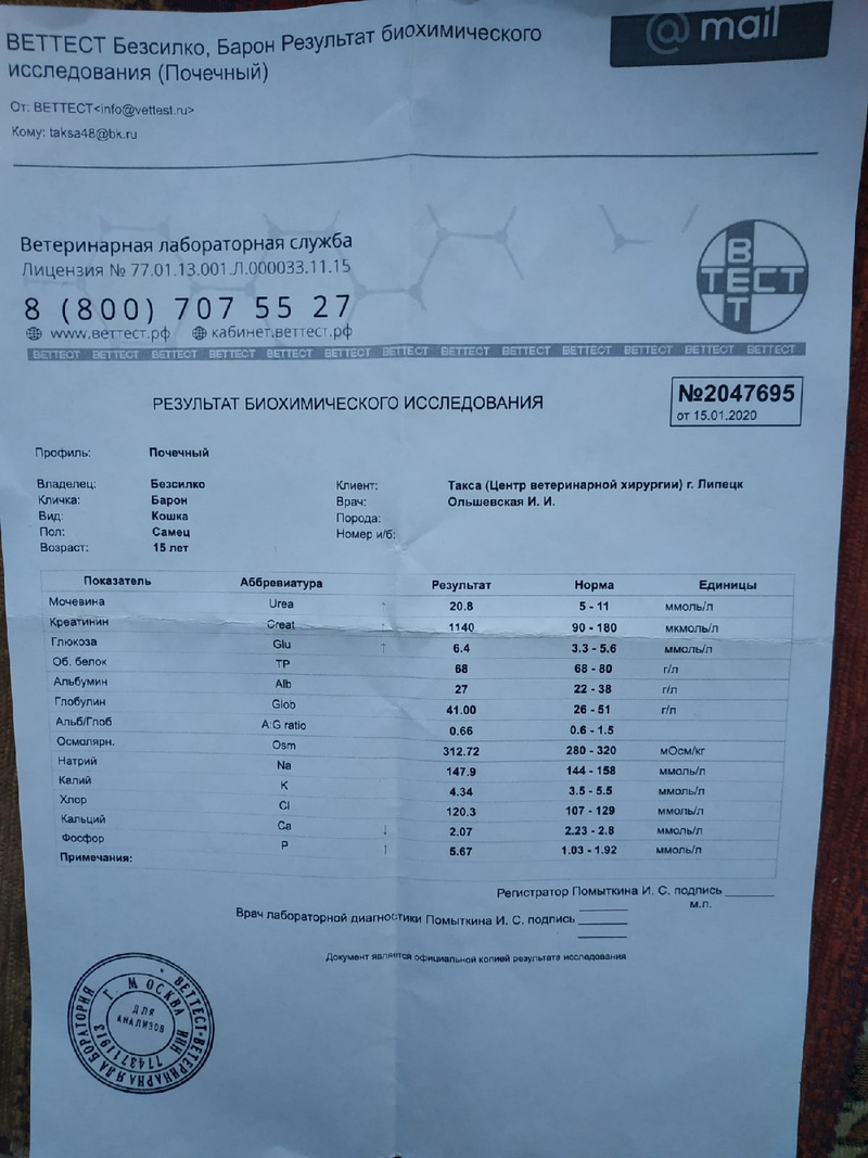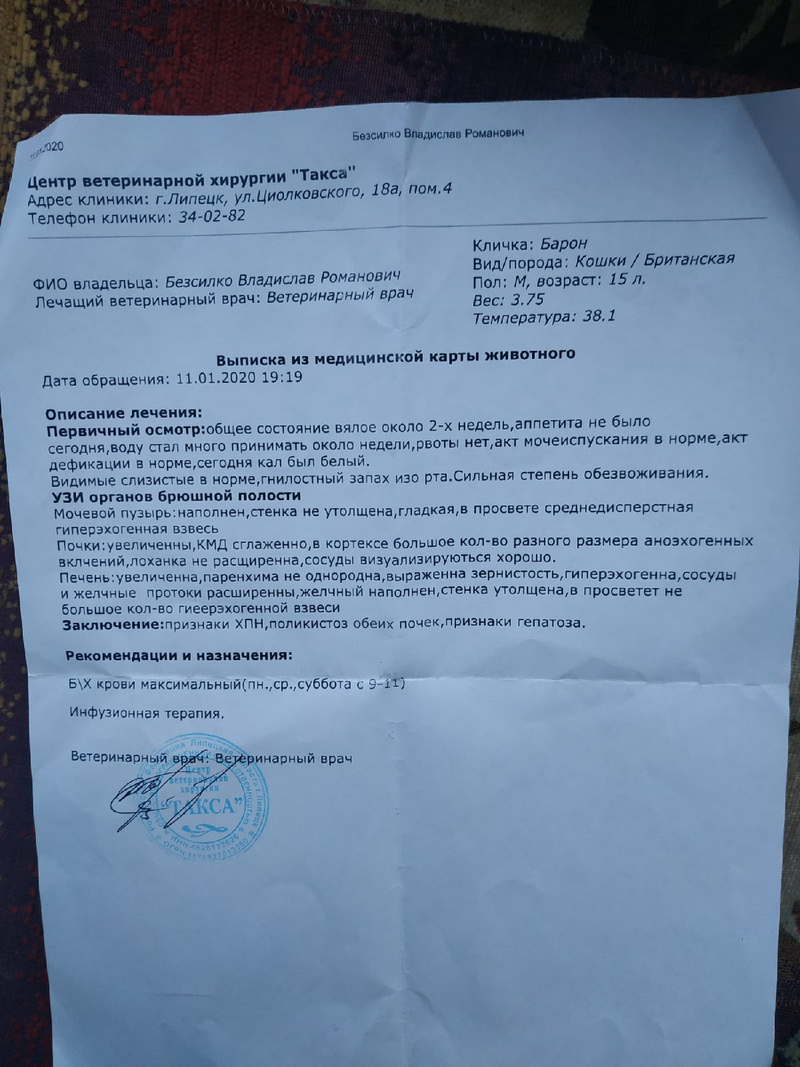 11 января было принято решение отвезти его в вет клинику, описав там его симптомы предворительно поставили диагноз ХПН, так же сделали узи брюшной полости описание узи будет прикреплено фотографией.