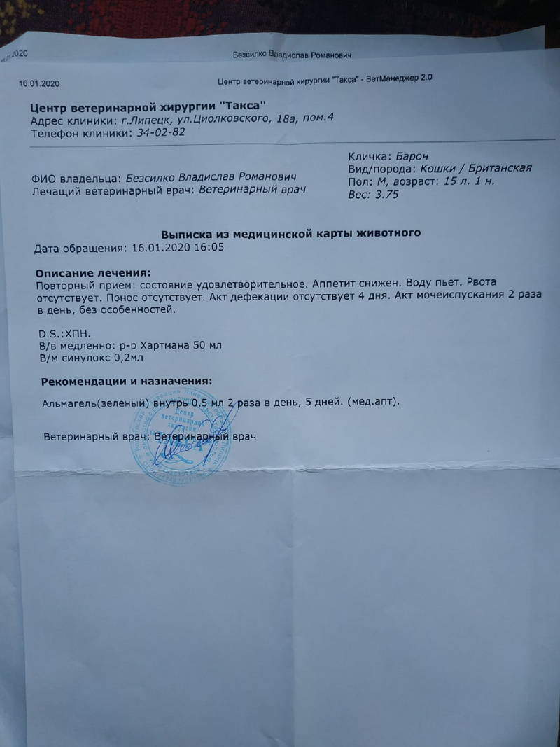 16 января повёз его в клинику, сказали Б/Х готова, прикрёплю фото ниже, результаты плачевные понимаю сам, сказали ставить капельницу и делать укол ( поставил) и давать ему альмагель зеленый два раза в день для снижения фосфора утром и вечером по 0.5мл по приезду домой отказался кушать паштет, но покушал куриное филе, еще нравятся ему кушать сосиски, от корм отказывается вообще. в туалет по большому так и не ходил с 12 января