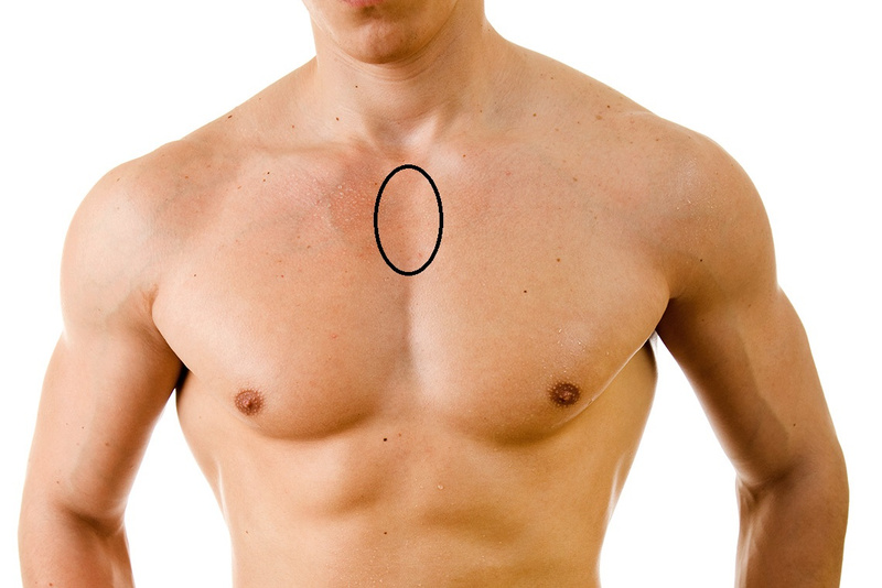 Доктор Божьев рекомендует пальцами простукивать область вилочковой железы(область отмеченная эллипсом) в целях укрепления иммунитета