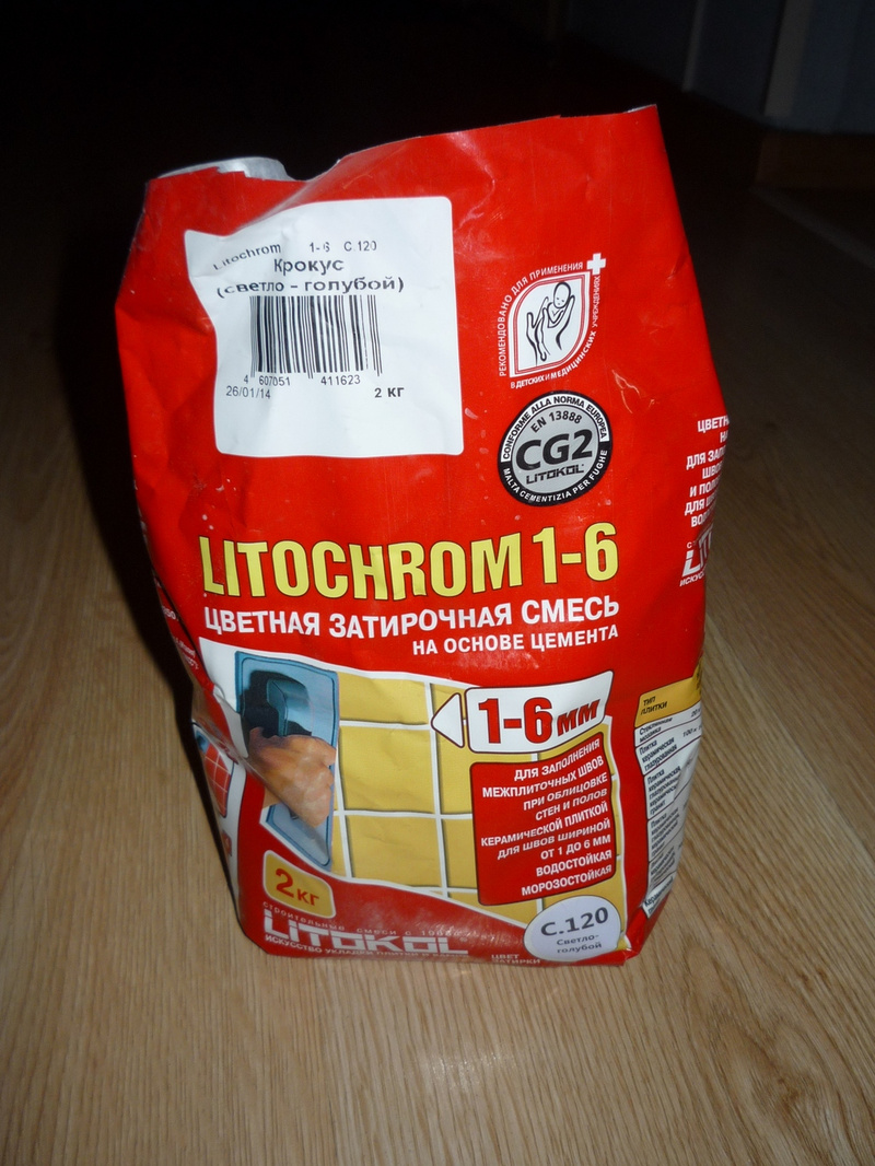 2. Затирка для плитки примерно половина пакета цвет светло-голубая.