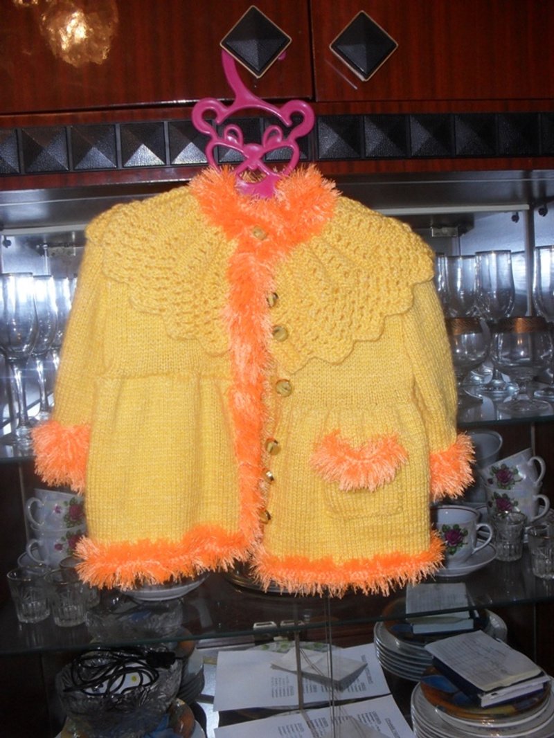 Вязанный на заказ желтый кардиган, со штанишками и беретом. На рост 74-80 см. Цена 300 рублей.Все еще актуально.