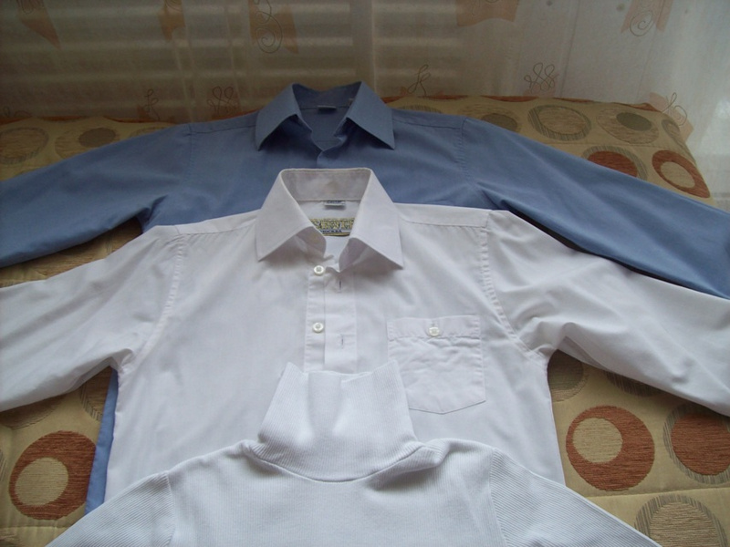 2. Рубашки по 50 руб: белая (122-128 см), голубая (128-134), водолазка (рост 128-134);