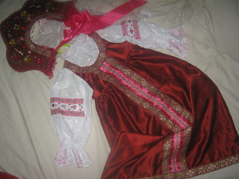Сшила старшей на утренник сарафан с кокошником ( я не швея как могла, так и сделала, это практически моя первая шитая вещь). Такого точно ни у кого не будет! На материал для сарафана потратила всего 20 рублей! На осенней распродажев Домоцентре купила несколько кусков ткани (интерьерной, портьерной) . Пайетки, бусинки у меня всегда есть в запасе для поделок. Подкупила только праздничной тесьмы.