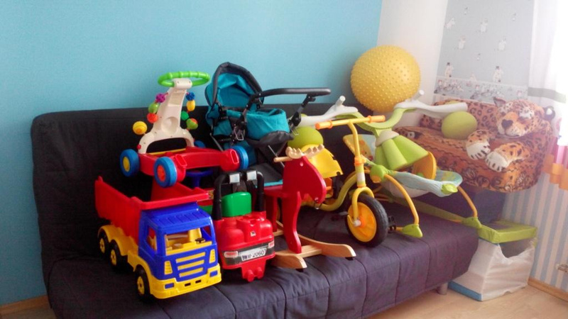 Если с хранением мелких игрушек все боле менее понятно (ИКЕА рулит), то вот что делать с крупногабаритом - ума не приложу Сейчас все это стоит как попало и создаёт ощущение постоянного беспорядка. Это только часть, а дальше же будет только больше.