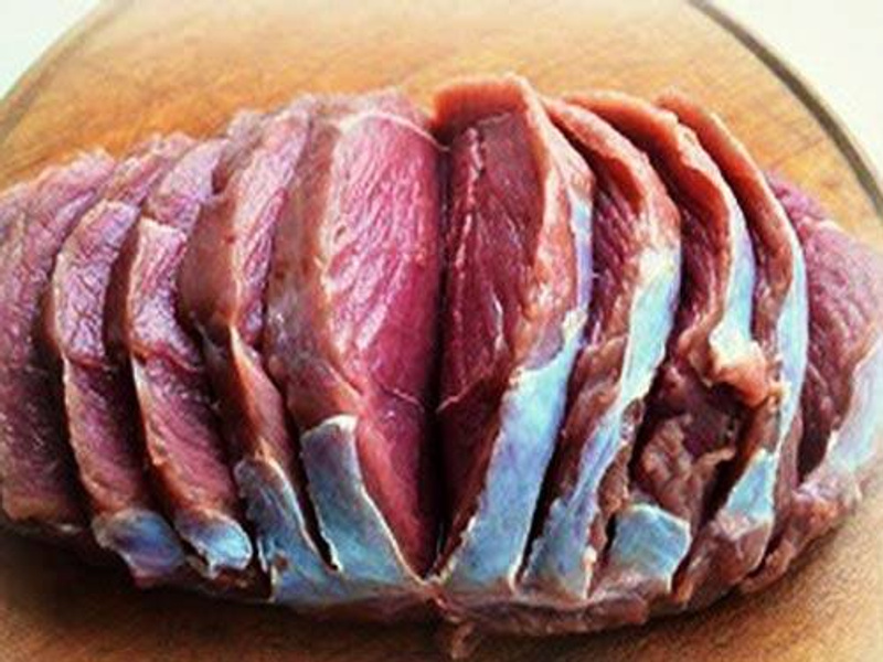 Выбрать ровный (прямоугольный), плотный кусок мяса (как на буженину). На мясе сделать поперечные надрезы, не дорезая до конца.