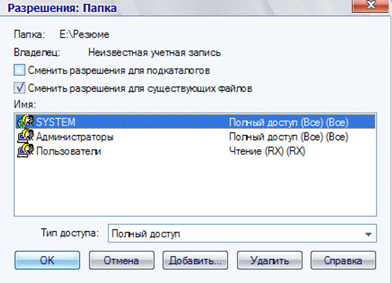 Была win7, что то намутил я там с доступом к папкам и сетевым ресурсам, потом поставил XP, после этого в папке отобразились неизвестные группы доступа, пришлось становиться сначала владельцем папок, потом удалять ненудные, и проставлять у группы ВСЕ - Полный доступ...