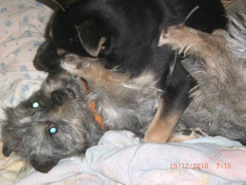 Прошу я взяла, когда ему было примерно 2,5 месяца. Отсутствие лапы или, как выражается наш тренер, «некомплектность» меня практически не волновала – у собаки же целых четыре лапы, и отсутствие одной не должно сильно сказаться. Волновал меня только его характер, темперамент, и как он уживется с моей старшей собакой, нашим нежным и впечатлительным Фиделем. Сразу могу сказать, что я все оценила верно: нет никаких проблем из-за его «безногости», а все сложности касаются его темперамента и их взаимоотношений с Фиделем. "
