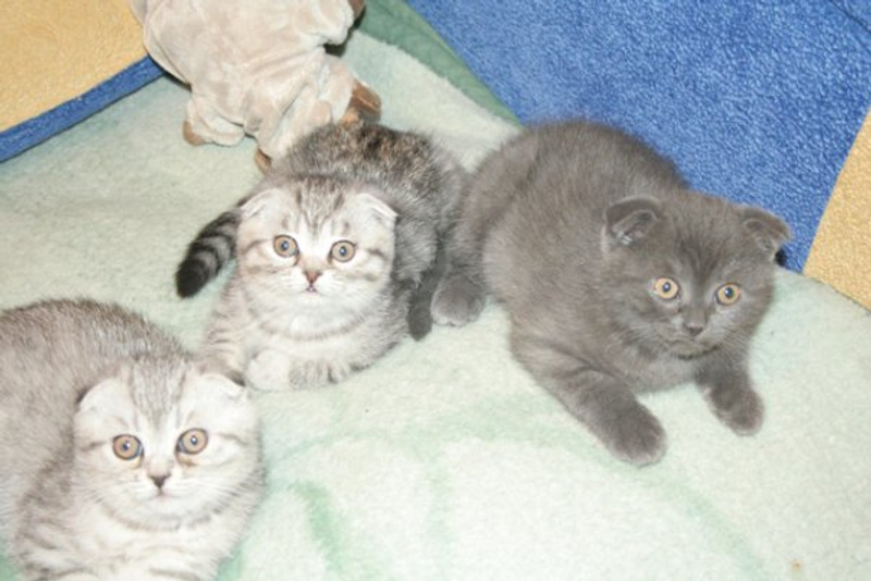 и наконец третий котёнок,имеет плотно прижатые уши с двойной сильной складкой,чётко вписывающиеся в овал головы и направленые вперёд,прекрасно развитые щёки,нет претензий по окрасу,котёнок шоу класса.(с)
