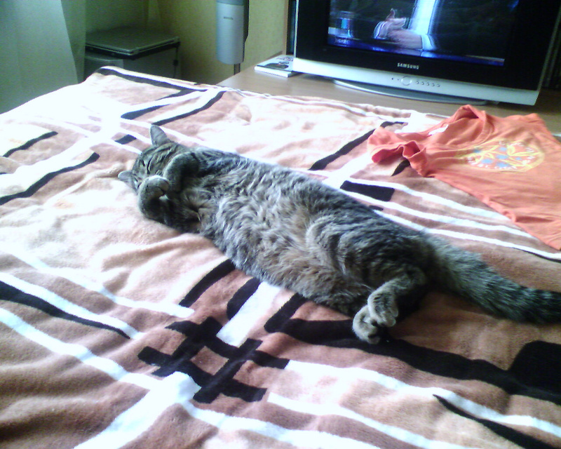 Нашла несколько фото с телефона...где то я это видела...у мужа на майке кот точно вот так спит