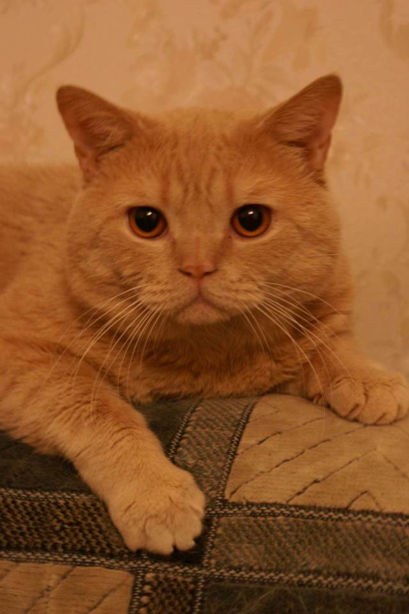 Кот крупный, с массивной головой. Кремовый в небольшую полоску.