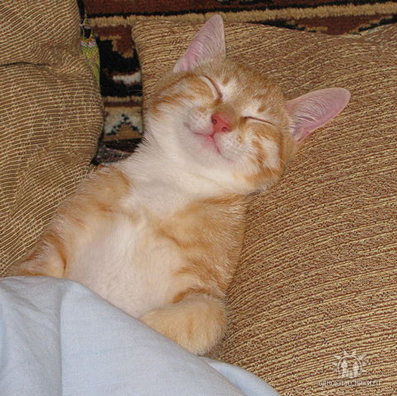 Рыжик прикольный. Муж посмотрел и говорит, что котенку снится что-то смешное. Так похоже на улыбку выражение мордочки.![]()