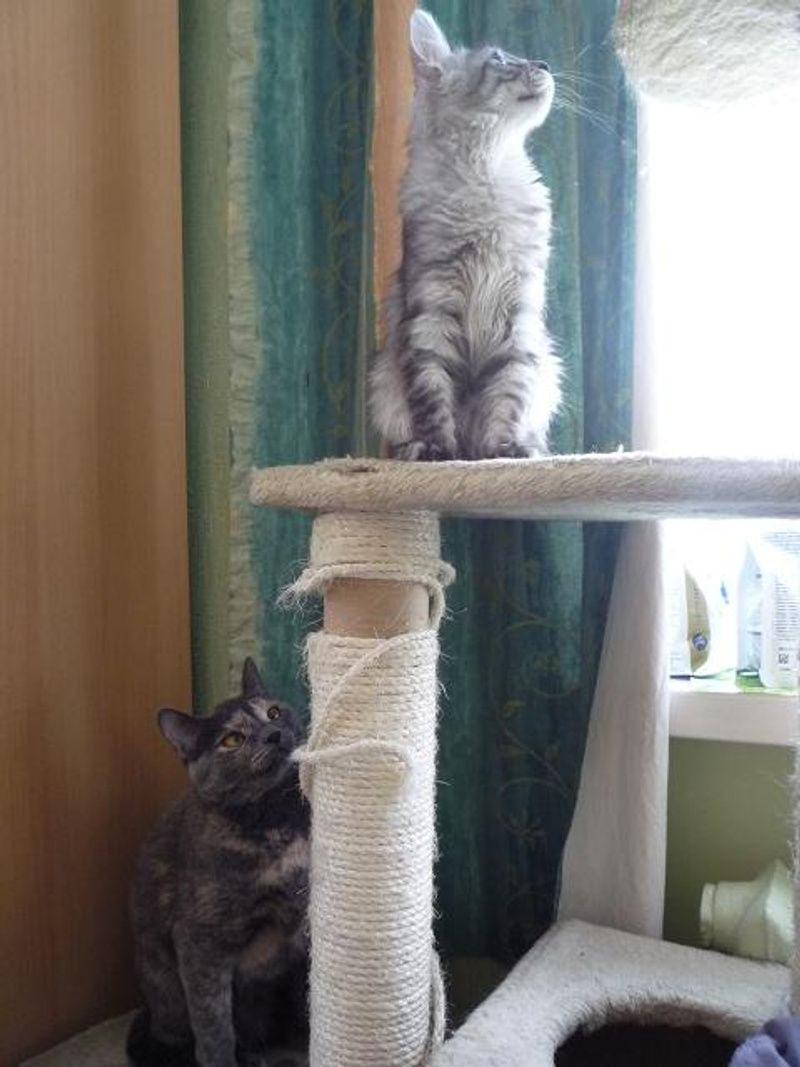 Взрослая кошка взяла моду есть корм для котят. Взял ей тот же Hill's NB только для взрослых, отчасти проблема решилась. Как-то он ей больше Purin'овских "глянулся". Теперь к своей миске на подоконнике, куда котёнку пока не допрыгнуть, подходит регулярно, соответственного маленького объедает меньше. Пройдёт совсем немного времени, прыгучесть у молодого увеличится, и он точно сможет запрыгивать наверх.