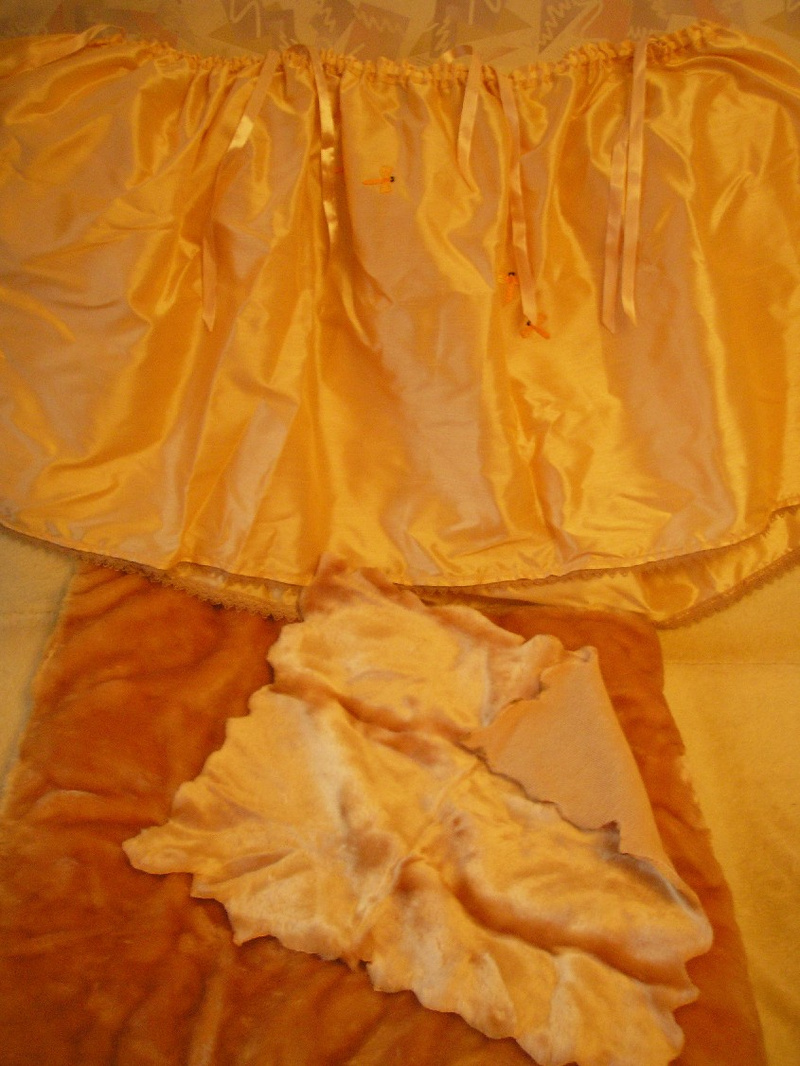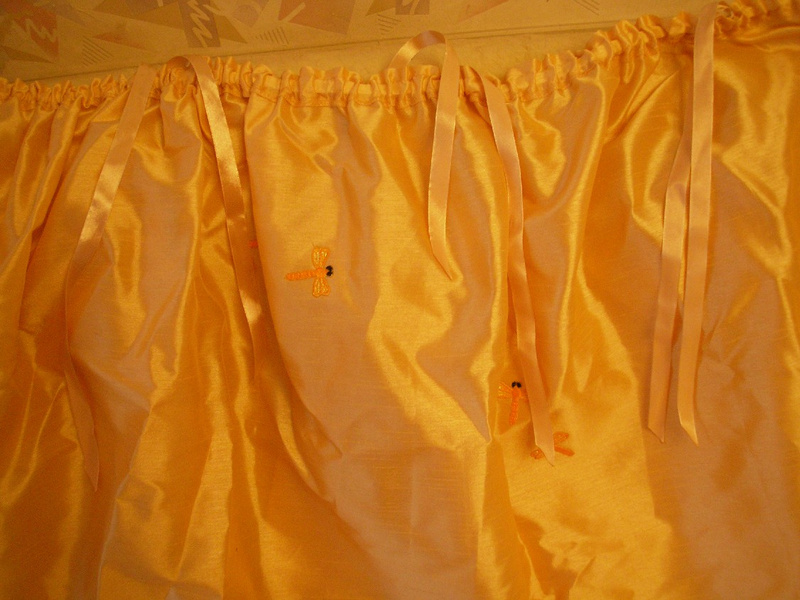На фото плохо видно, там искусственный мех на подстилочке, а занавески золотистая шелковистая ткань, с бантиками. А мальчик там грустил и плакал.