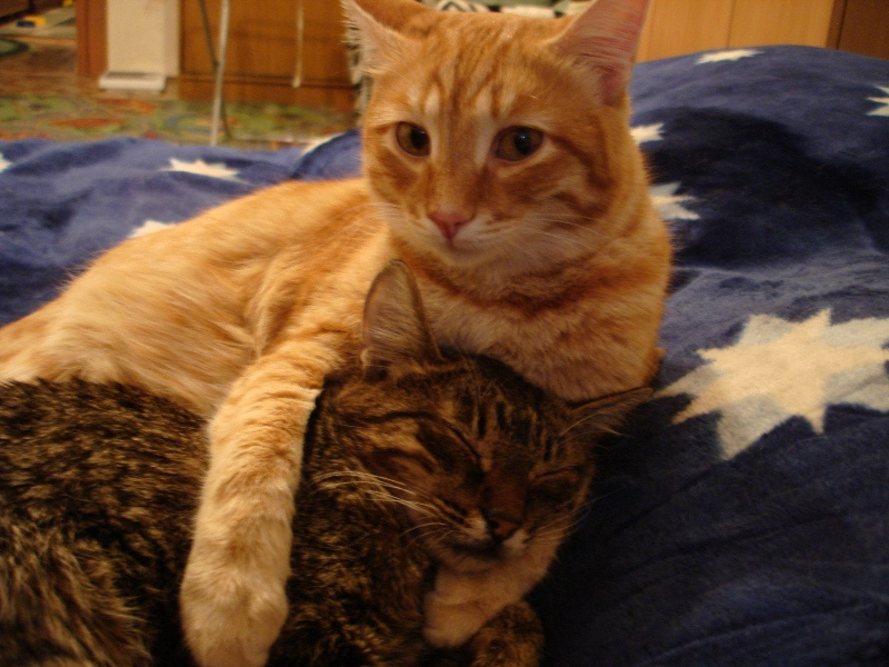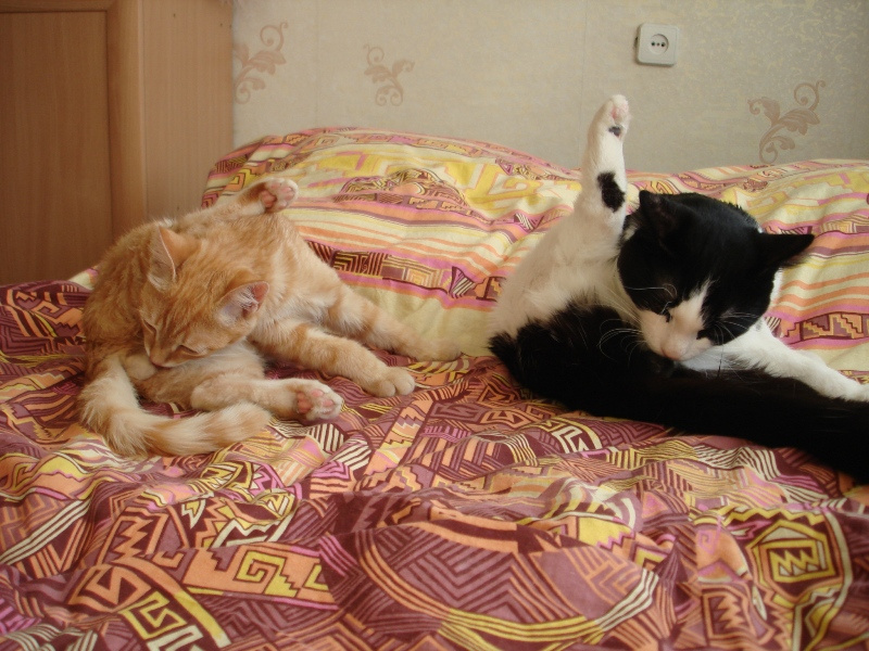 Дася уже часа два носится и мырчит - все пытается Шаню развести на побегать. А Шаня лежит на диване и смотрит на него абсолютно пофигистски. Опять начал ссать на диван - теперь уже из ревности, видимо, что Шане столько внимания уделяется...
