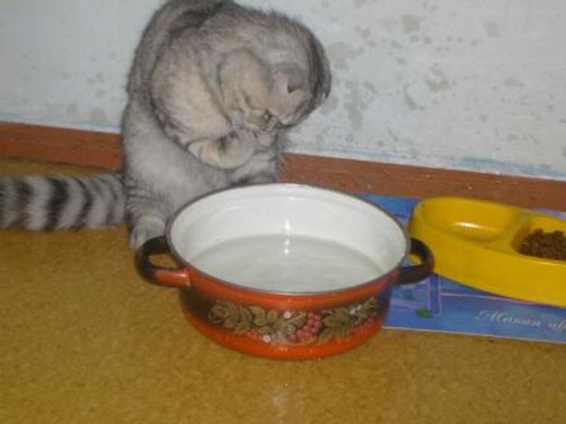 А у меня тазик с водой в ванной стоит... Литров на 5... Правда мои уже большие.. Но и сейчас иногда там лапы мочат и облизывают..... Или отряхивают. И за брызгами наблюдают...