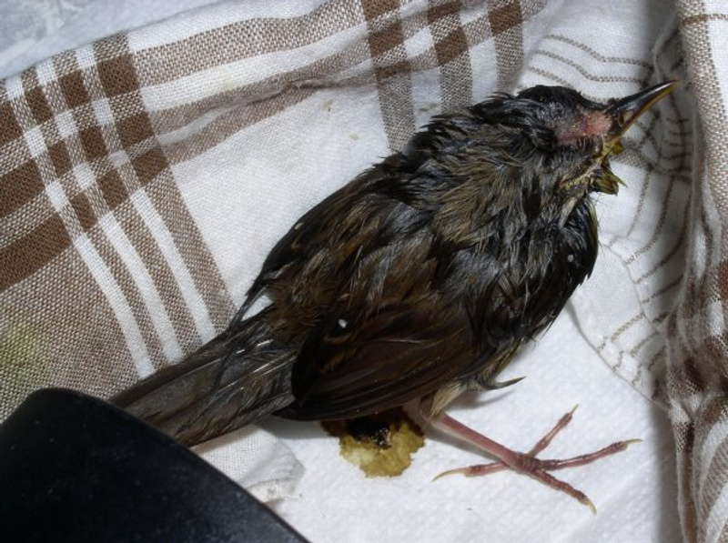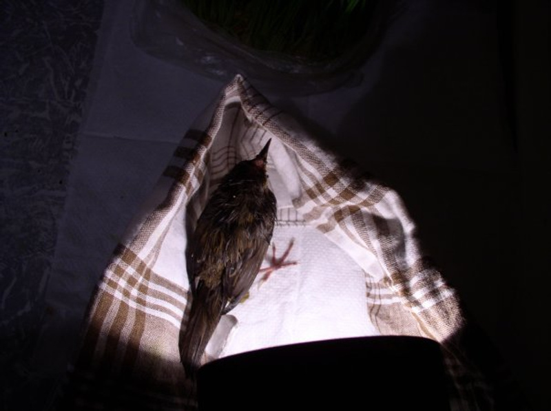 Помощь, любая, очень нужна. Вчера его нашла на улице около работы (кстати, город Новосибирск), летать не умеет, либо летает на очень маленькие расстояния. За весь день вчера выпил только воду. Вечером и утром поел безмолочную смесь и попил воды. Весь день бегал по комнате и едой не удалось накормить. Вчера вечером сходили к орнитологу, он сказал что это птенец, с сотрясением, но сотрясение не страшное и глаз целый. Вчера левый глаз почти на половину был закрытым. Сейчас на 1/3 закрыт, вроде ориентируется в пространстве, но может идти прямо по столу, стол кончается, а он продолжает движение. Еще сказали что задние пальцы ног у него не сломаны, а это из-за того что у него не развит хватательный рефлекс. Врач затруднился назвать птицу и обозначить чем его кормить, если выживет в течении суток-двое, то нормально все будет. Сейчас пробовали его чуть кашей накормить, пришлось насильно, воды из пипетки тоже чуть попил.
