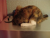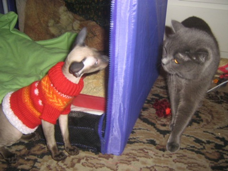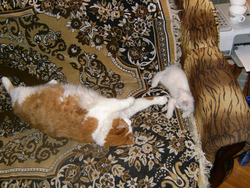 Жаль мой кот его к себе близко не подпускает. Совсем не привык к другим животным. А маленький ему проходу не дает, все играть с ним пытается, прыгает на него, а тому не нравится, он рычит и убегает но, не всегда успешно
