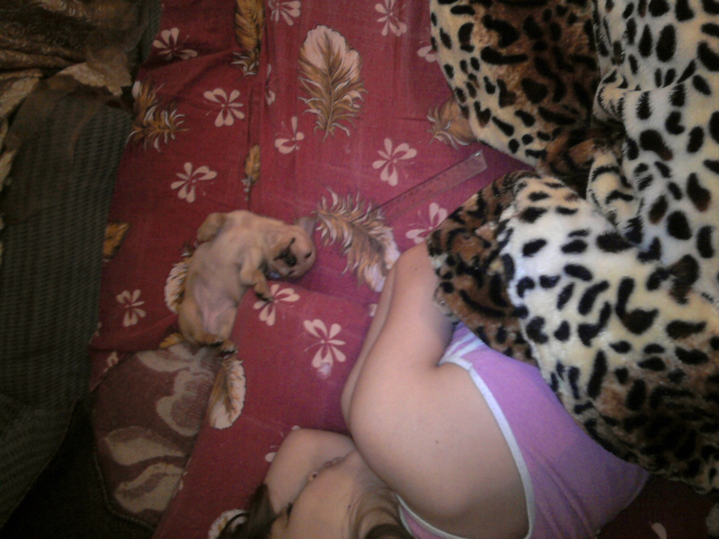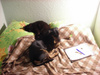 Да это щенок, 2,5 мес. (900гр) - наш с дочкой новогодний подарок. Порода той-терьер, но правда у нас есть сомнения: лапки коротковаты и родилась она без хвостика (бабушка не совсем легально была ввезена в Россию, и все детки у нее рождались без хвостика как и мама нашей крохи), но нам все равно, она наша красавица и любимица