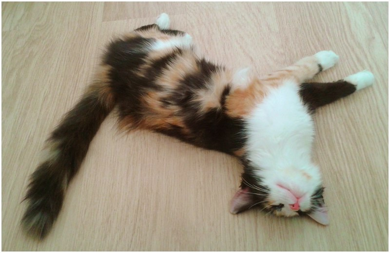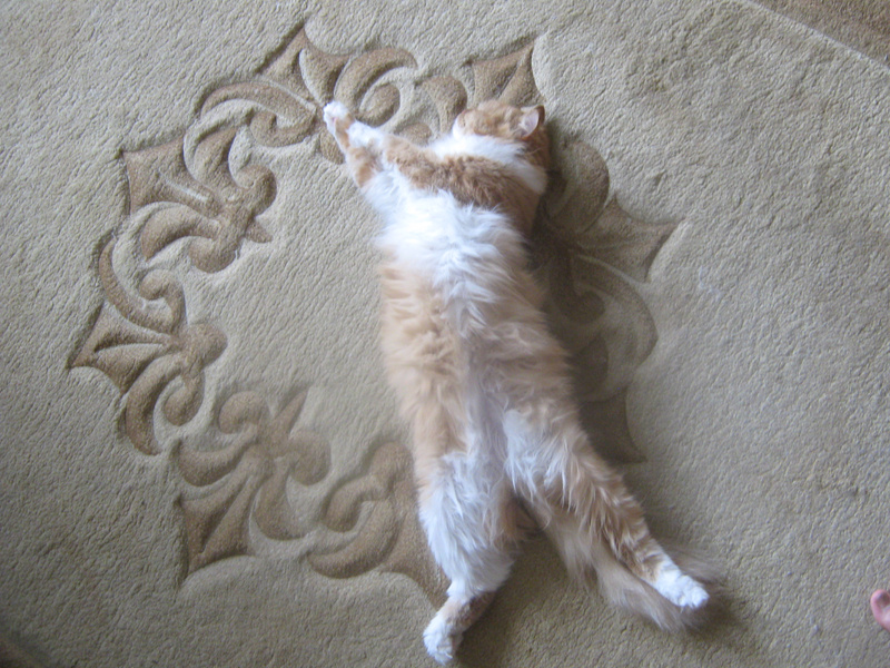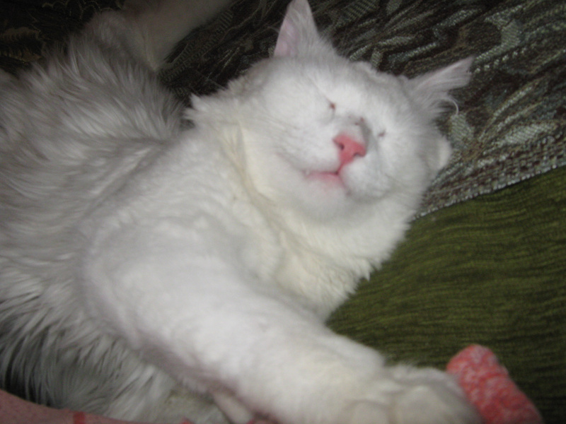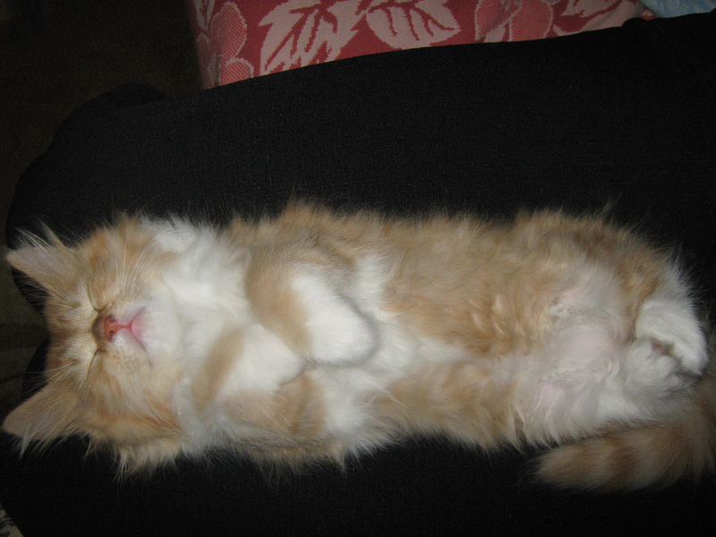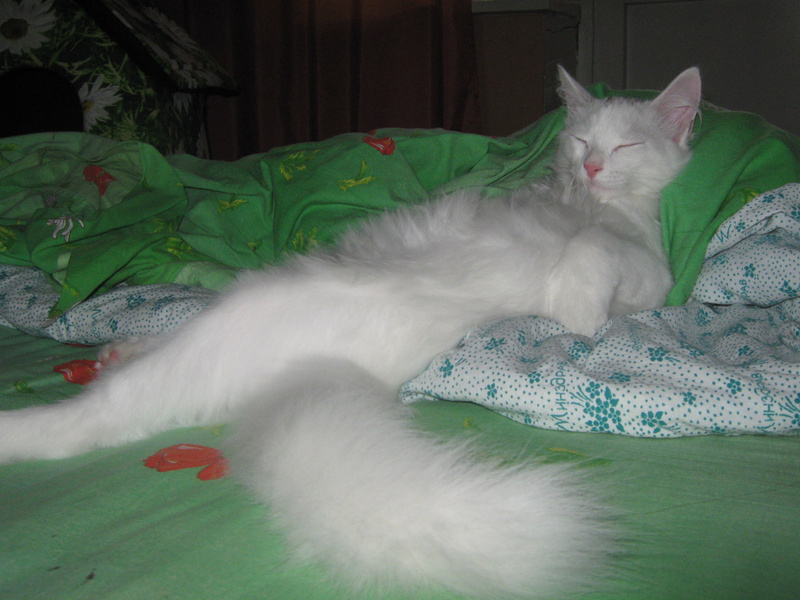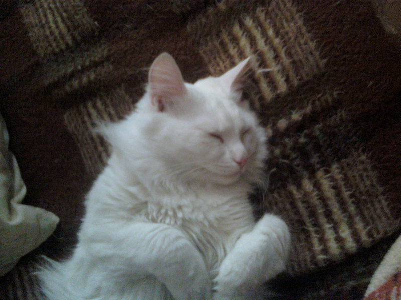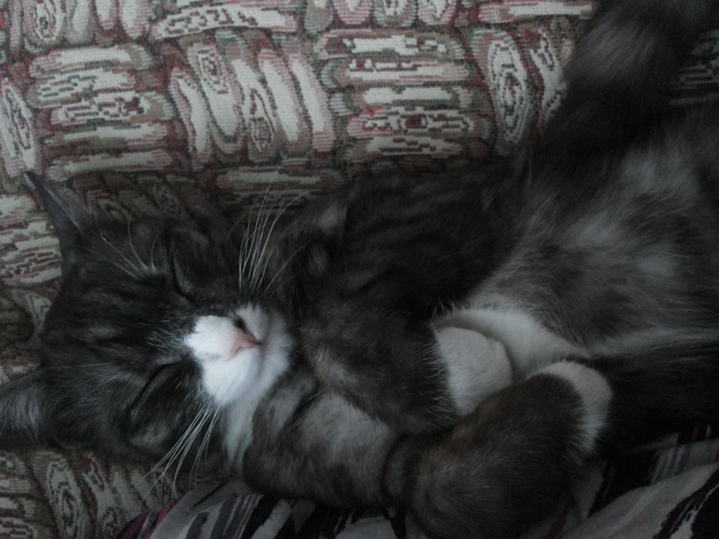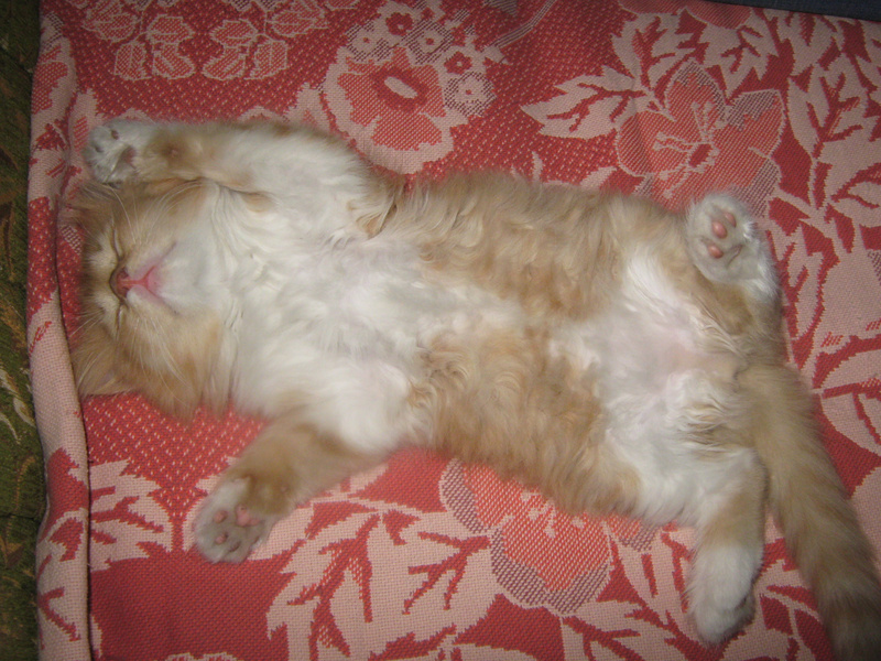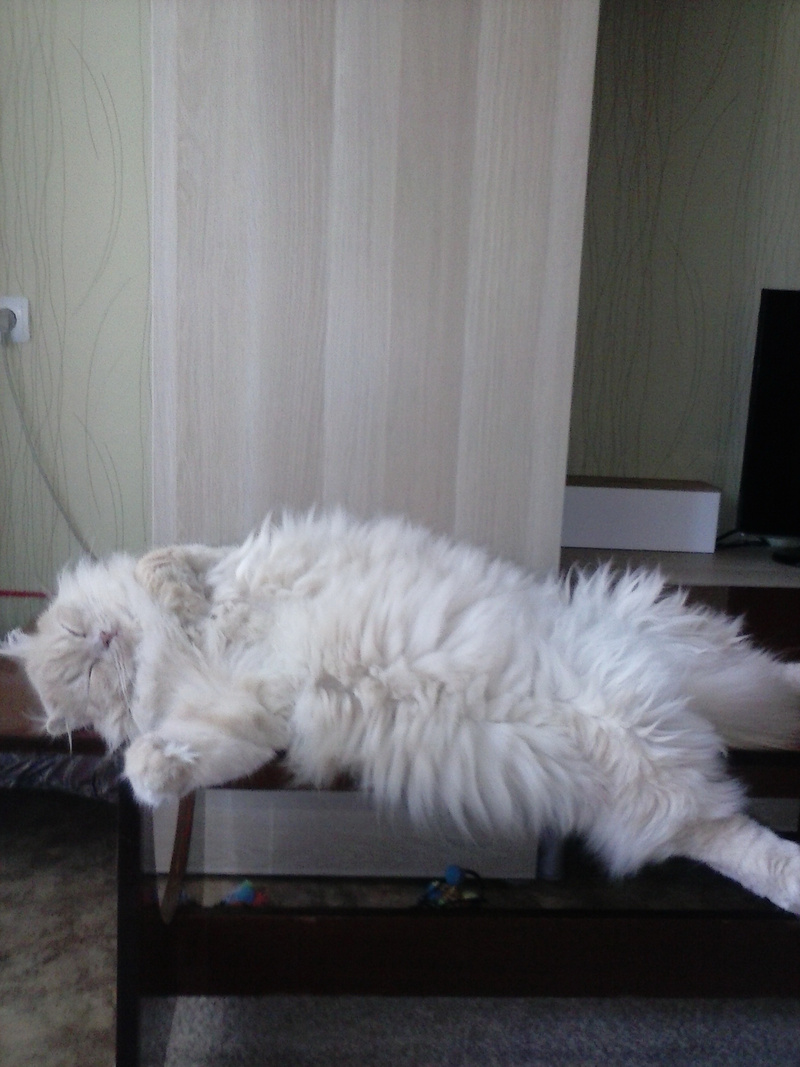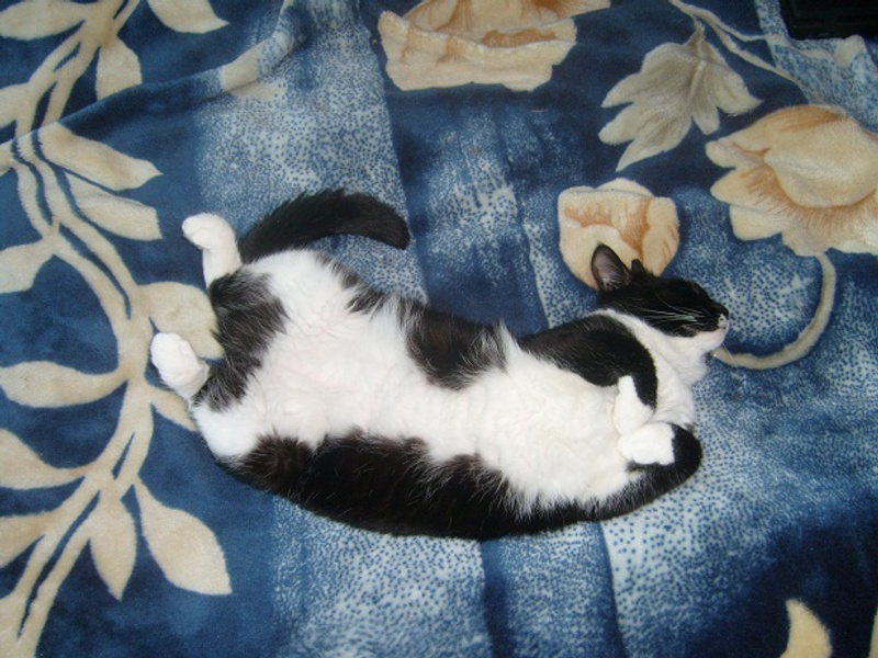 После первого же кадра, он перевернулся на другой бок. Хотела в лежанку перенести, так муж не разрешил. Говорит - значит коту так удобно ))) Низззя, не трогай.