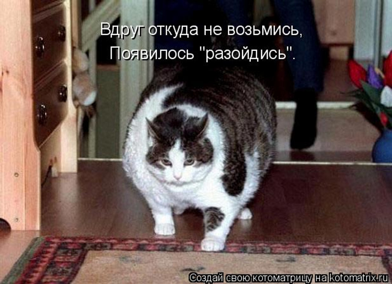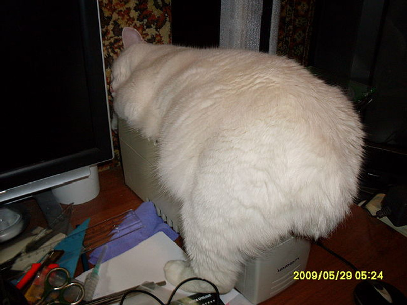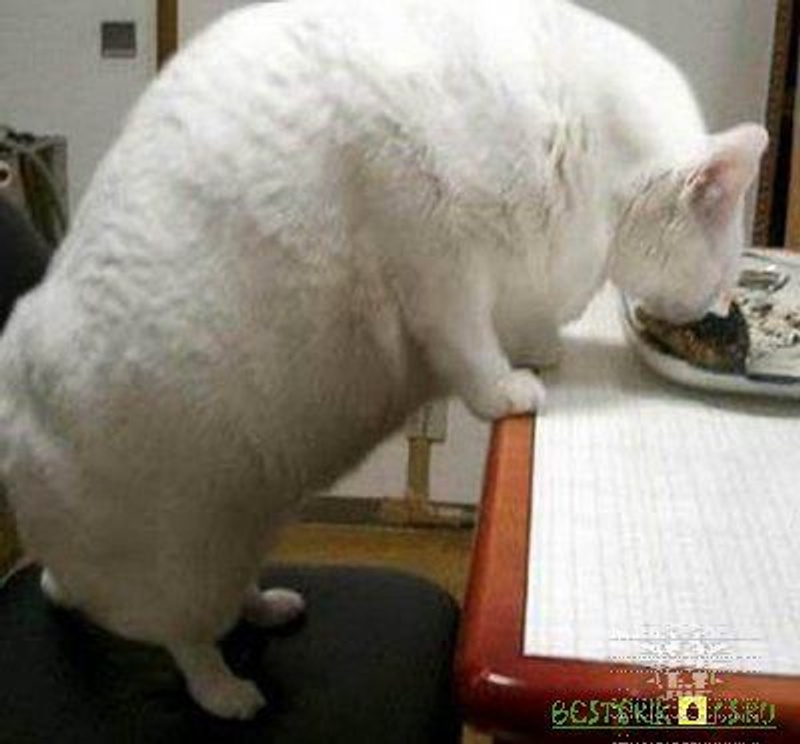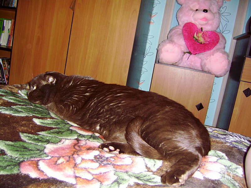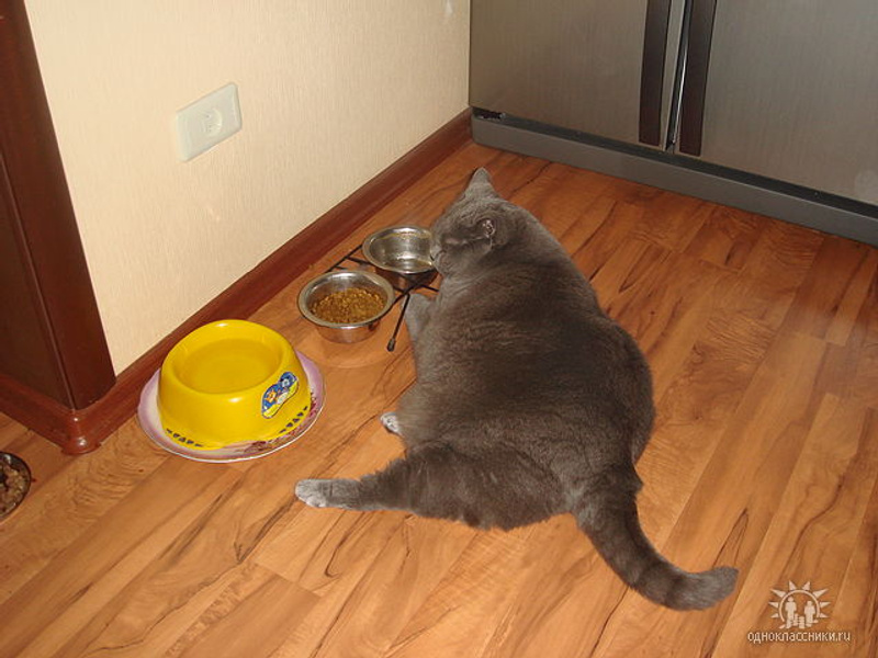 Его прошлой зимой, за месяц моего отсутствия, родители раскормили. Тройную дозу, против обычной, на день кошакам давали ("а вдруг не наедятся?"). Запретила и близко подходить к их еде, кормлю только сама и строго 2 раза в день. Схуднул... слегка :), примерно до своих прежних габаритов.