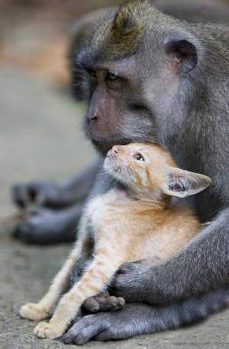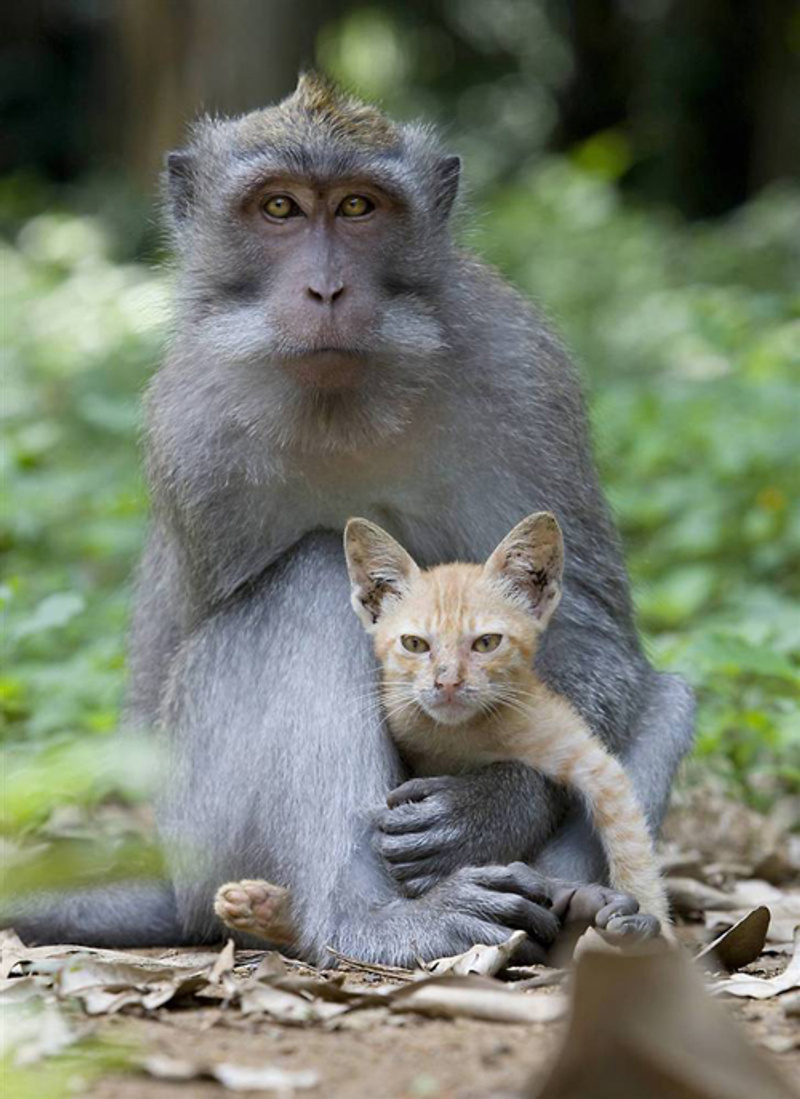 Фантастическая история происходит на Бали. Дикая обезьяна усыновила брошенного котенка и заботится о нем, как о собственном ребенке. Эта длиннохвостая макака живет в лесу в Убуде, это регион на Бали, Индонезия. Фоторепортер Энн Янг, которой посчастливилось стать свидетелем этой трогательной истории, утверждает, что обе стороны совершенно счастливы и довольны сложившейся ситуацией.