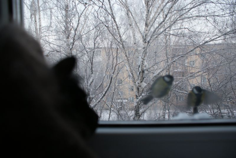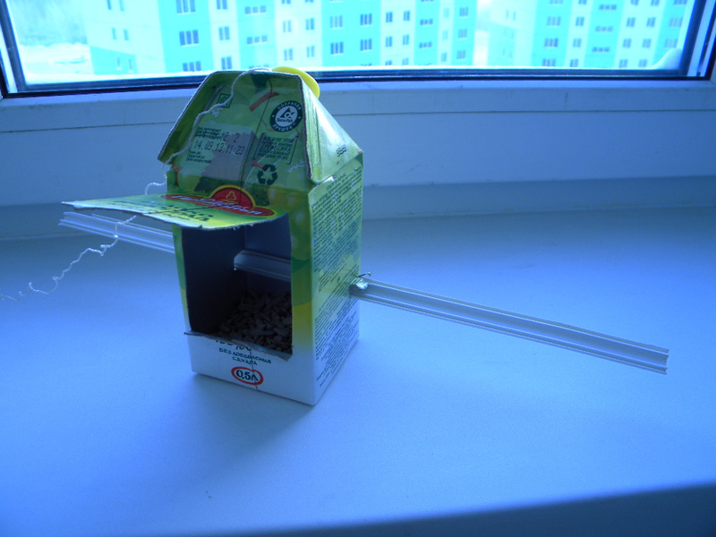 Сметану покупать не стал - увидел более удобный тетрапак 0,5 литра сок - привязал суровую нитку за горлышко, закрутил пробку, вырезал окошко, сзади прорезал дырочки и вставил пластиковую (да хоть какую твердую) палочку, насыпал семечек (нашлись только очищенные не жареные и не соленые), привязал второй конец нитки к ручке кружки (ее на внутреннем подоконнике поставил) и опустил конструкцию за окно немного ниже наружного подоконника. Палочка нужна, чтоб ветром окошко кормушки не развернуло к стене.