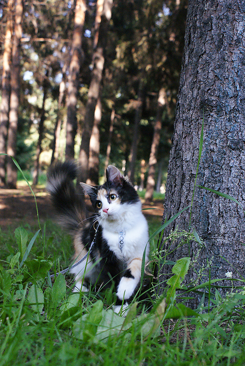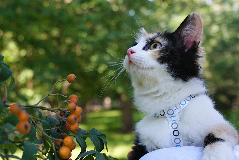 Какая яркая она кошка! как себя на улице чувствует?прекрасно. сначала пугалась громких звуков, грохота, а обратно на моём плече ехала всю дорогу, по сторонам глазела) опасается собак и детей, а так нормально. в переноске вообще замечательно, молчит и созерцает)