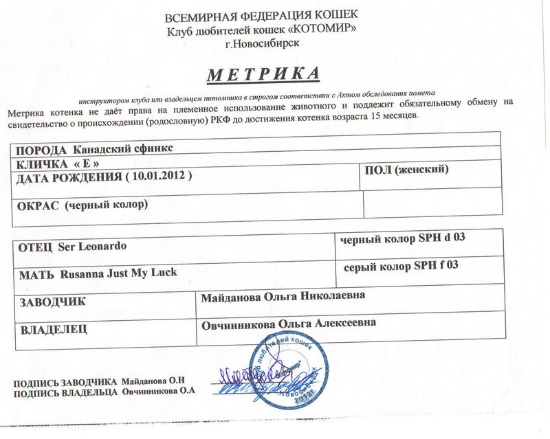 Почти год назад, девушка купила котенка (как канадского сфинкса) по объявлению на Авито, в разведение. Девушке при покупке выдали метрику (см скан) т.к. человек мало, что понимает, ее не смутило ни «серый/черный» колор, ни то, что в графе «владелец» вписан неизвестный человек. За «метрику» она доплатила еще 1000 р. (за кошку 7.000 или 8000 – забыла)