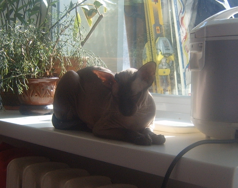 Что касается питания, пержний хозяин ее держал на сушке роялкониновской для сфинксов, изредка давал влажный корм. А я начала кормить ее и влажным в том числе (т.е. чашка с сушкой стоит всегда, а влажный я ей пару раз в день давала - пакетика на 1-1,5 дня хватало)...