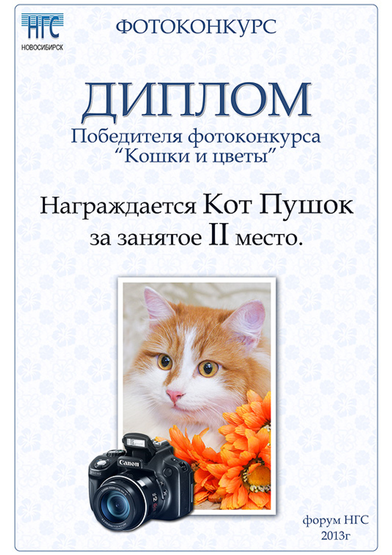 Мы с Пушком сердечно благодарим организаторов и спонсоров конкурса за такое очень позитивное и радостное событие на нашем любимом форуме.Спасибо, что, благодаря этому конкурсу, наших котохвостиков увидело и оценило столько людей. Мы с большой радостью приняли участие.
