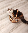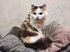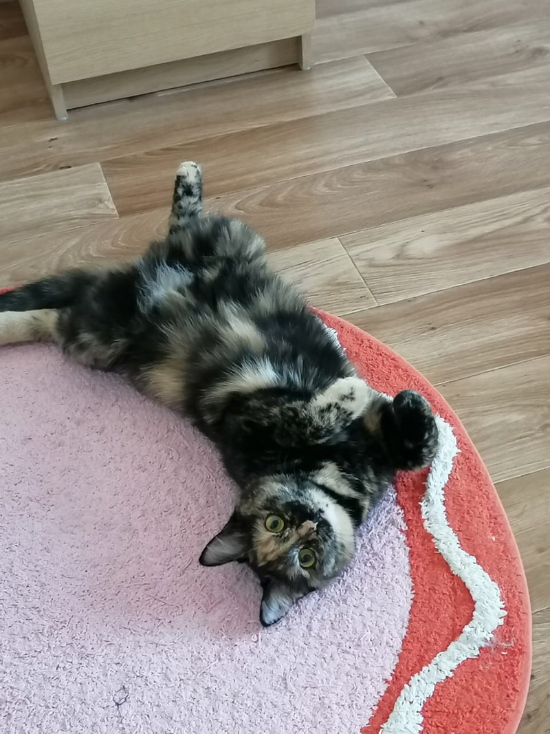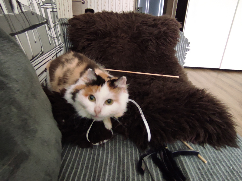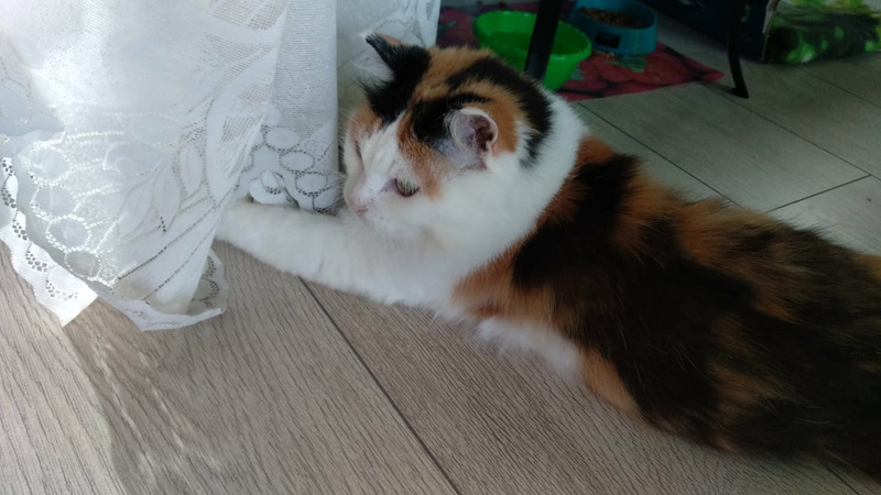 Она такая игривая, приходит просит поиграть, носится, скачет. Набегается и приходит обниматься. Лапами обнимет, прижмется и мурчит, аж песни поет. Потом еще оближет да надежности. Беляна вчера на такое проявление чувств смотрела с ревностью, потом отвернулась и демонстративно легла и давай хвостом во все стороны вертеть. Что означает на ее кошачьем: выгони эту трехцветную мымру и меня гладь!