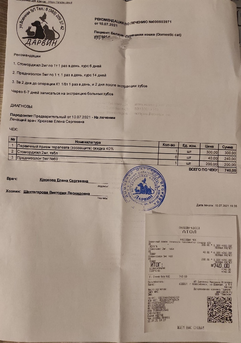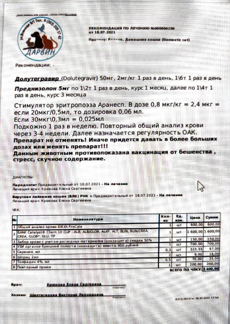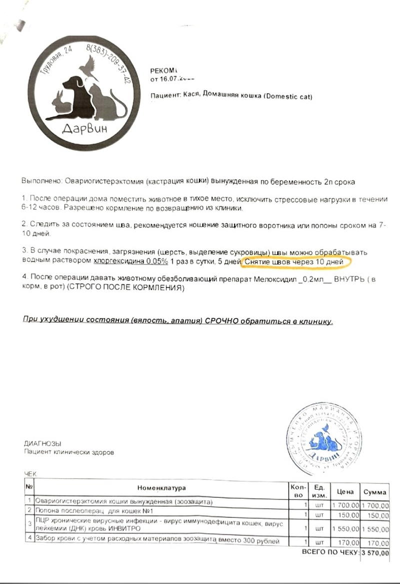 В субботу 16 июля ее стерилизовали в Дарвине. Она была беременной - 5 котят. Швы сделали обычные. Оперировала Прибыткова. Там же сделали взяли кровь на вирусы. Оплатила 3570 руб. Анализы - лейкоз+.