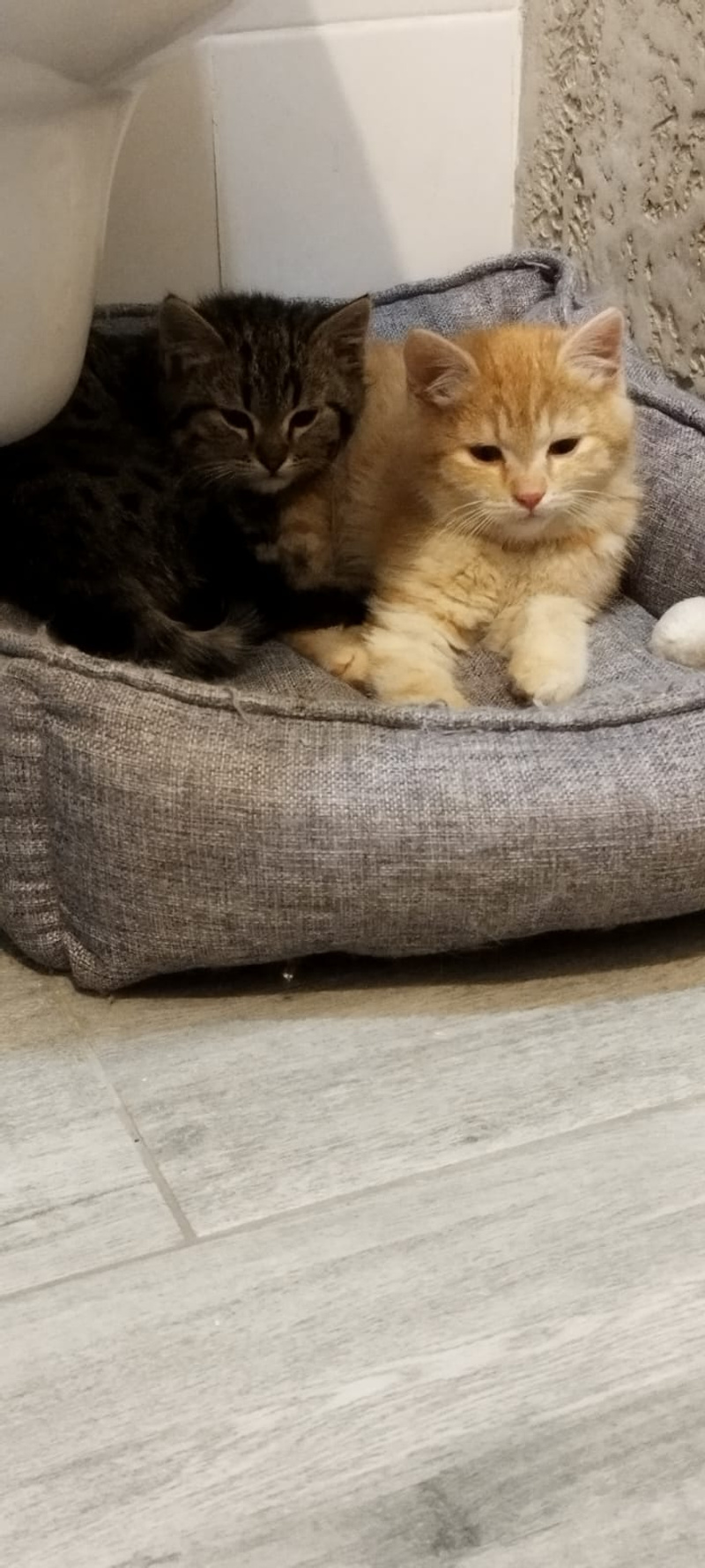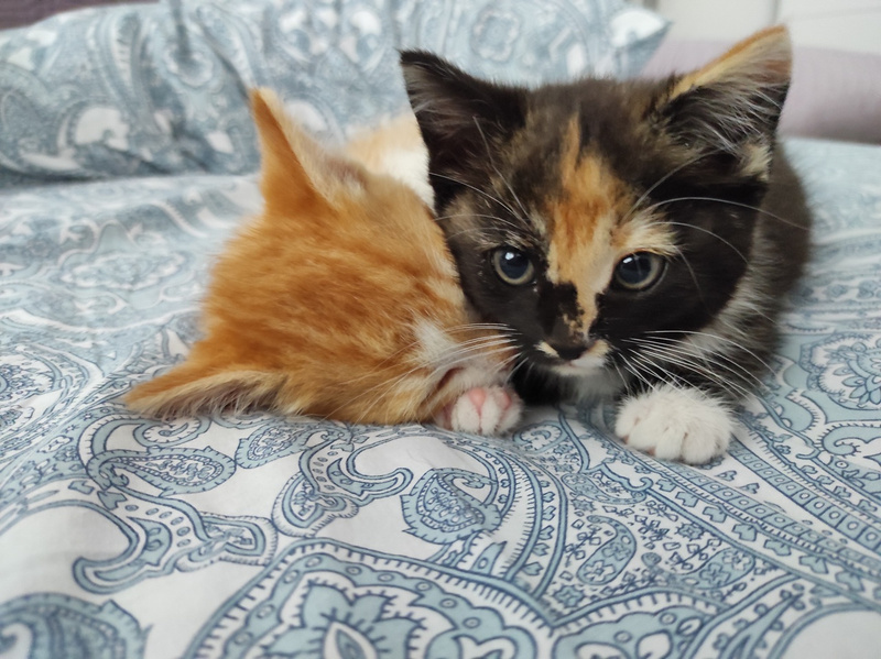 Вместе носятся, играют, Бусинка пищит чуть чего и сама еще на взрослых задирается. Когда некого укусить, то Буся кусает диванную подушку. Прям пиранья какая-то. Лоток у котят на отлично, аппетит отменный, Буся правда еще сушку плохо грызет, мусс ест и рычит.