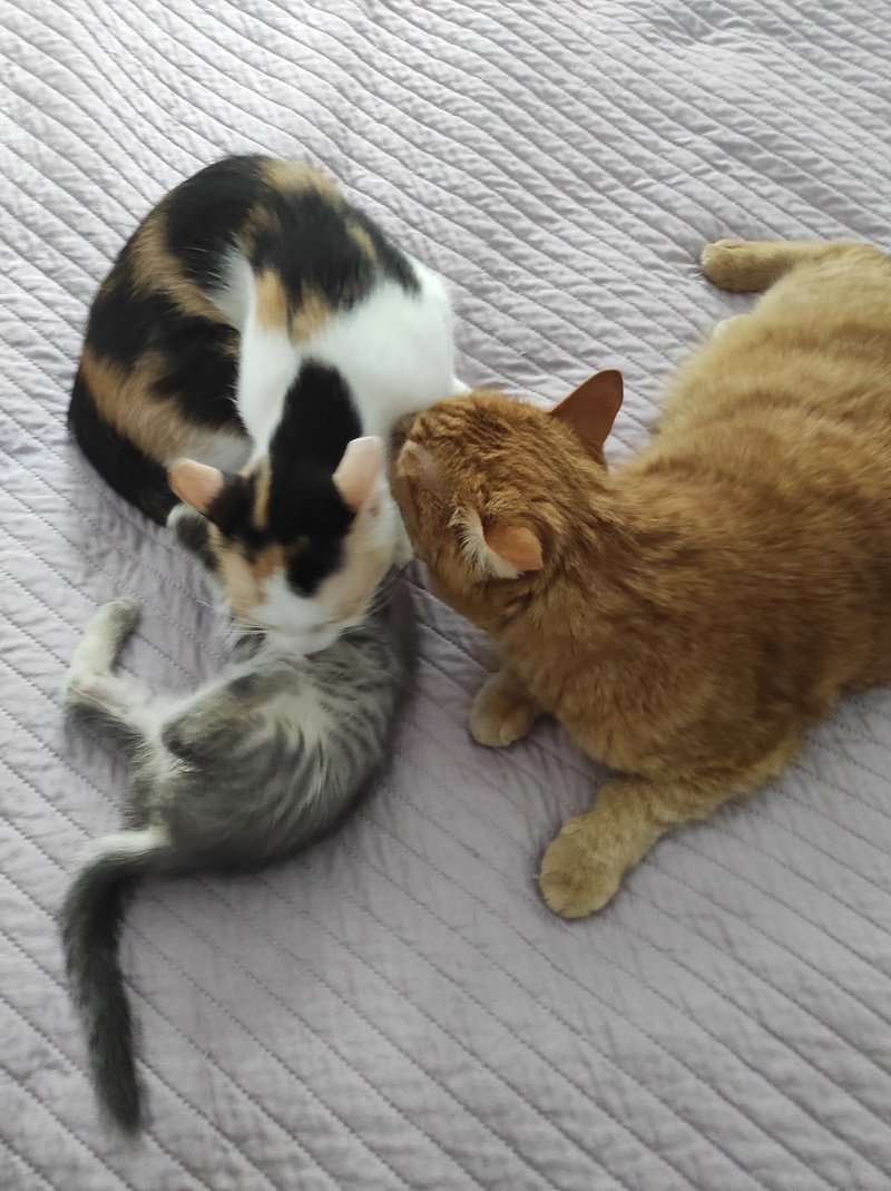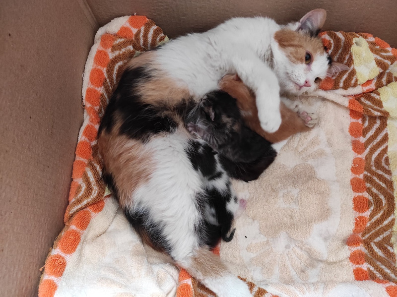 МаМуся от котят сначала в шоке была - не мои, но котята! Вылизывает и рычит, гудит, но моет их. Котята от нее сначала шарахались, сейчас сами приходят за нежностями и шалостями.