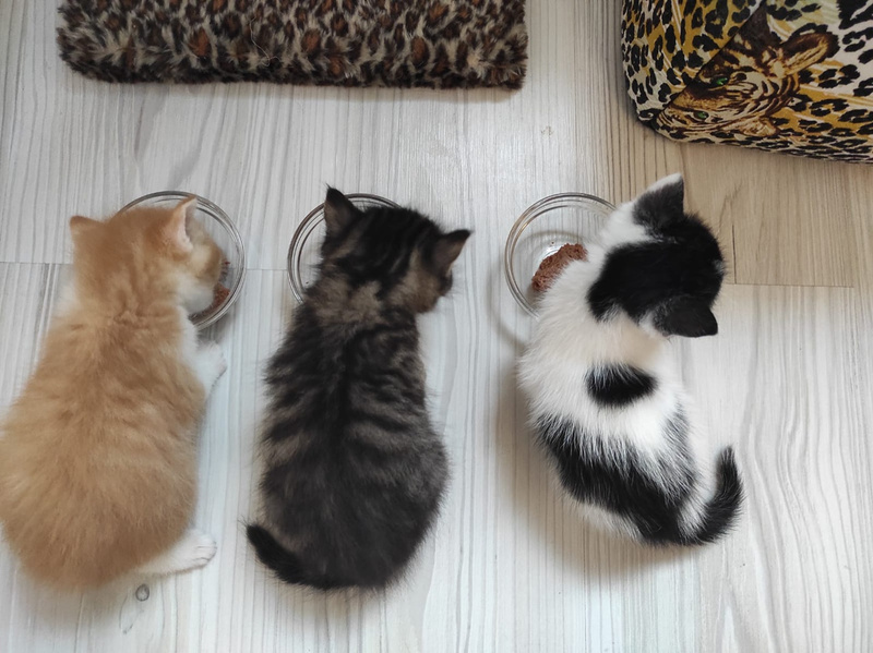Котята растут не по дням, а по часам. 14 мая им месяц, стали сами есть мусс, паштетик, на отлично ходят в лоток, причем пошли сразу в большой.